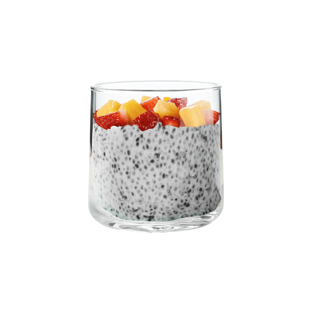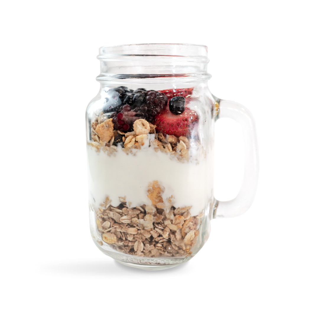 Yogurt bajo en grasa endulzado con miel, acompañado de granola, fresas, agráz y mora.