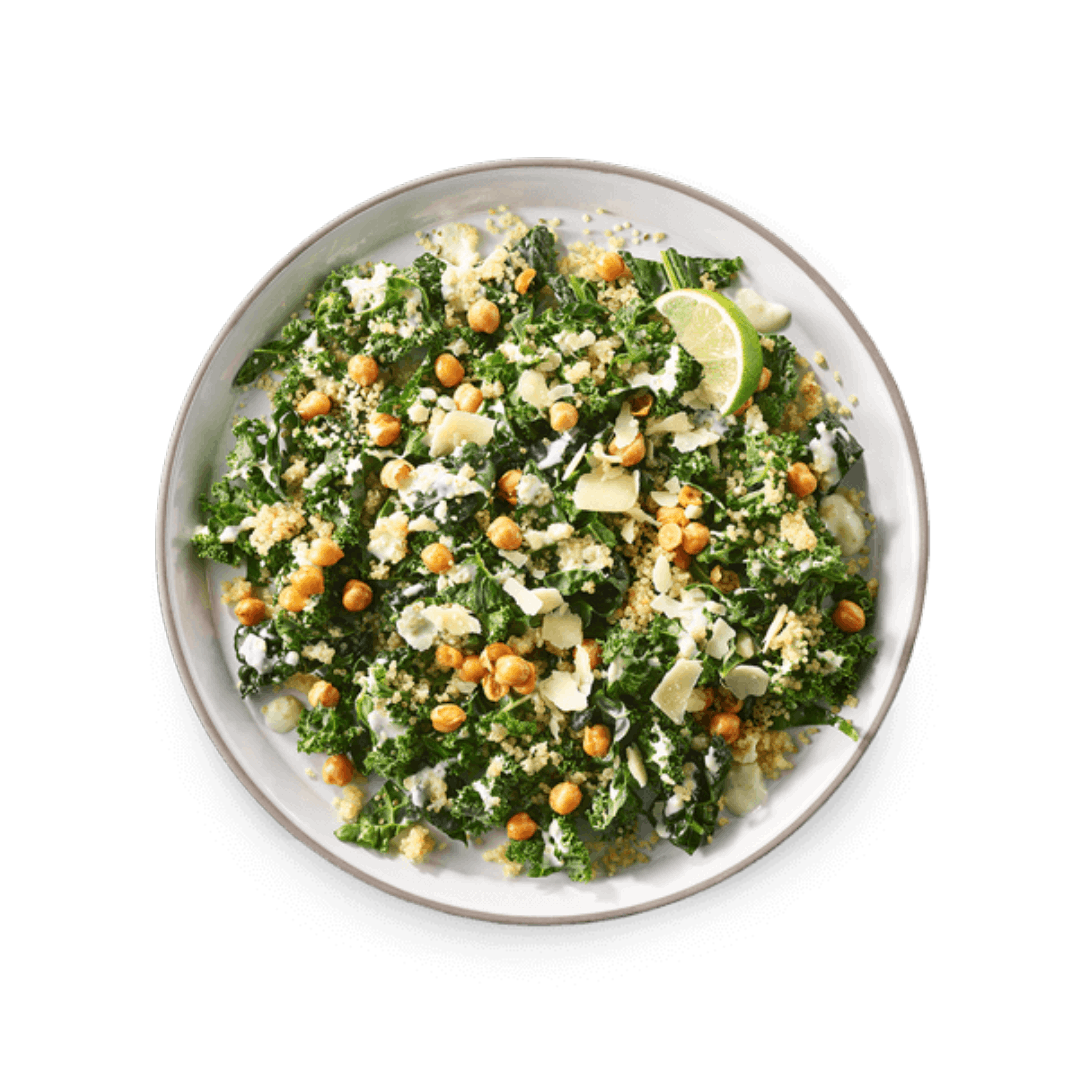 Kale, Lechuga Crespa, quinoa, garbanzo crocante, queso parmesano, limón y aderezo caesar de yogurt.
