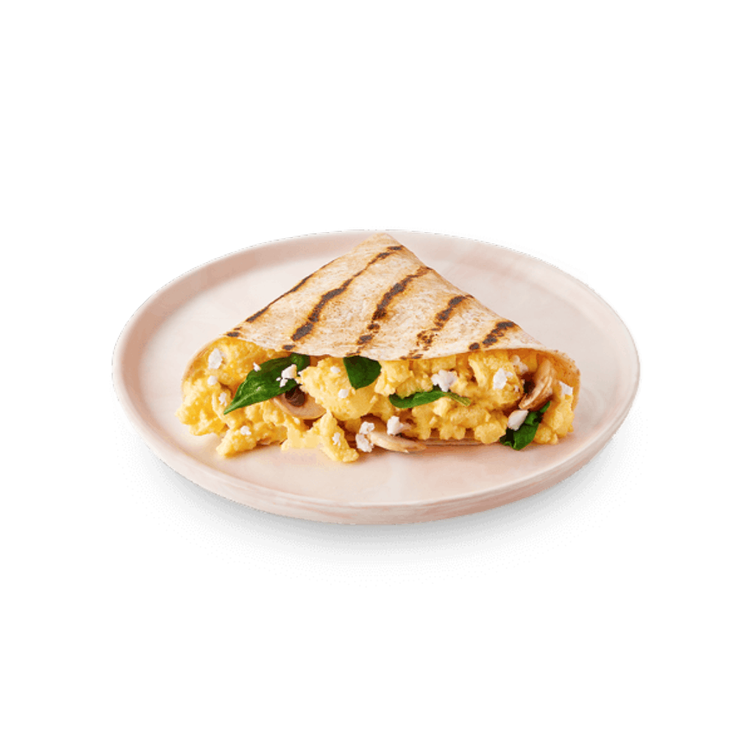 Tortilla integral rellena con huevos revueltos, espinaca, champiñones, pimiento asado y queso feta.