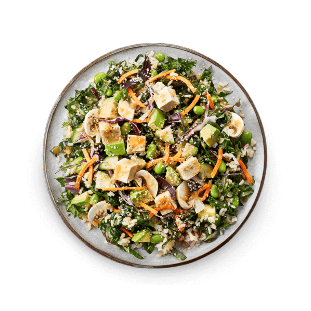 Kale, Lechuga Crespa, Arroz Integral, Aguacate, edamame, Champiñones, Pepino, repollo Morado, Zanahoria, Semillas de Ajonjolí, Vinagreta Miso Jengibre.