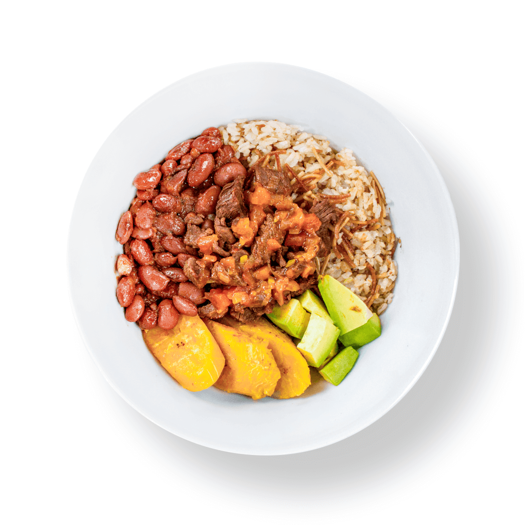 Carne en salsa bistec, arroz integral con fideos, frijoles rojos, tajadas de plátano maduro y aguacate, picante.