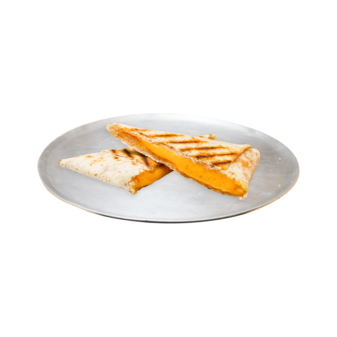 Tortilla integral rellena con arroz integral, fríjoles guisados, cebolla morada, maíz dulce, tomate, queso cheddar y salsa de yogurt bbq.
