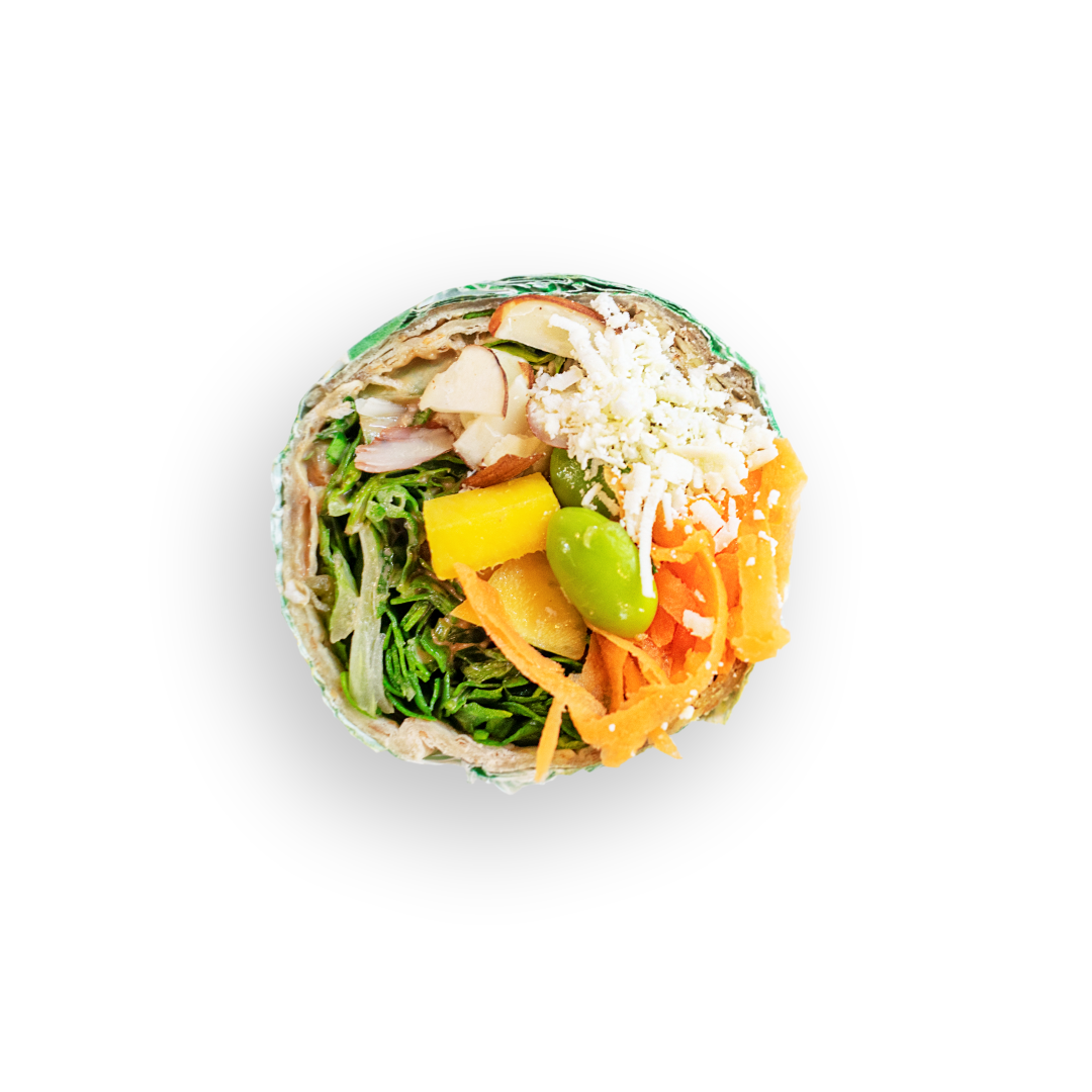 Tortilla Integral rellena de Espinaca, Lechuga Crespa, mango, zanahoria, edamame, almendras, queso feta y vinagreta balsámica.