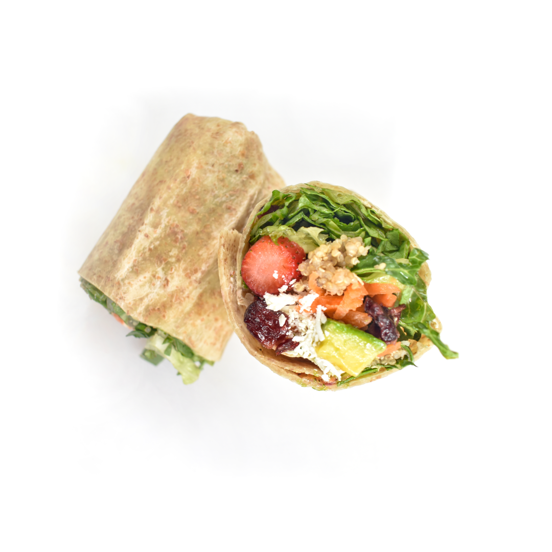 Tortilla Integral rellena de Espinaca, Lechuga Crespa, quinoa, arándanos, fresas, aguacate, zanahoria, queso feta y aderezo miel mostaza.