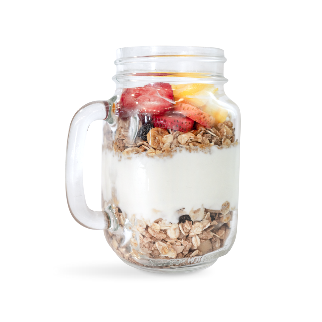 Yogurt bajo en grasa endulzado con miel, acompañado de granola, mango y fresas.
