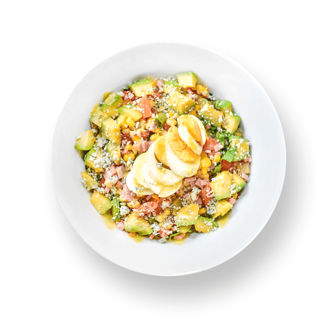 Lechuga Crespa, tocineta, huevo duro, aguacate, queso azul, tomate, maíz dulce y aderezo miel mostaza.