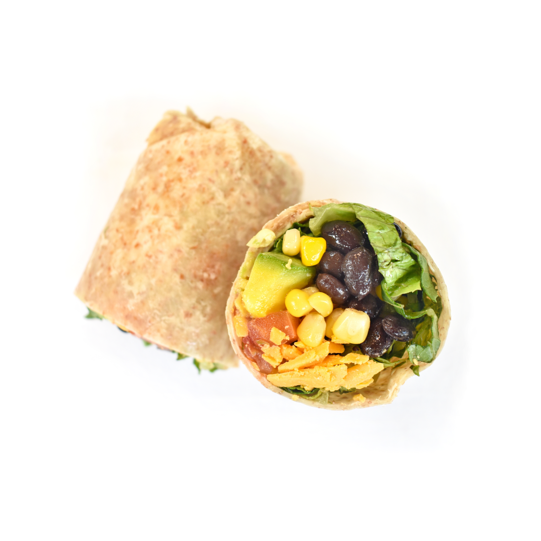 Tortilla Integral rellena de Lechuga Crespa, fríjoles negros, aguacate, queso cheddar, maíz dulce, pico de gallo y vinagreta de cilantro limón.