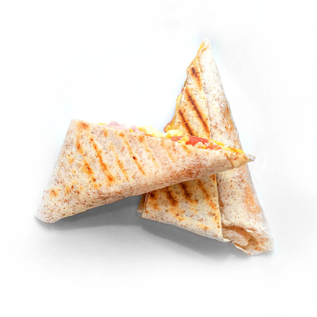 Tortilla integral rellena con huevos revueltos, tocineta, tomate y queso cheddar.