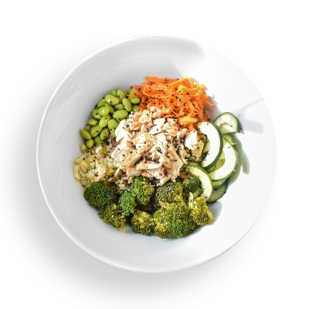 Pollo con arroz integral, brócoli, zanahoria, edamame, pepino cohombro, cebolla larga, ajonjolí y salsa teriyaki.