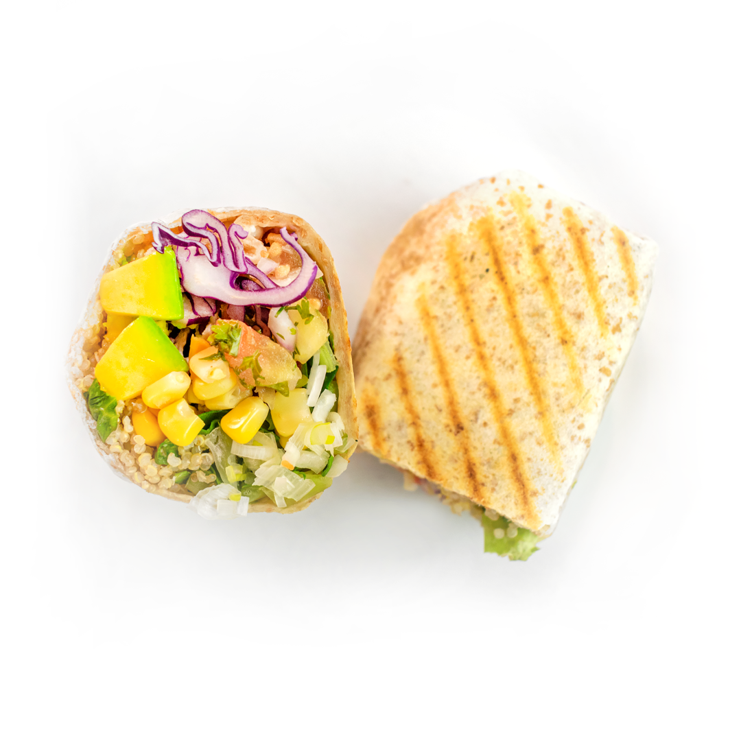 Tortilla integral rellena con quinoa, Lechuga Crespa, repollo, aguacate, pico de gallo, cebolla larga, maíz dulce y vinagreta de cilantro limón.