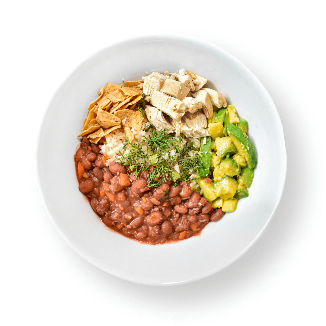 Pollo con arroz integral, frijoles chilli, aguacate, cilantro y chips crocantes de maíz, picante.