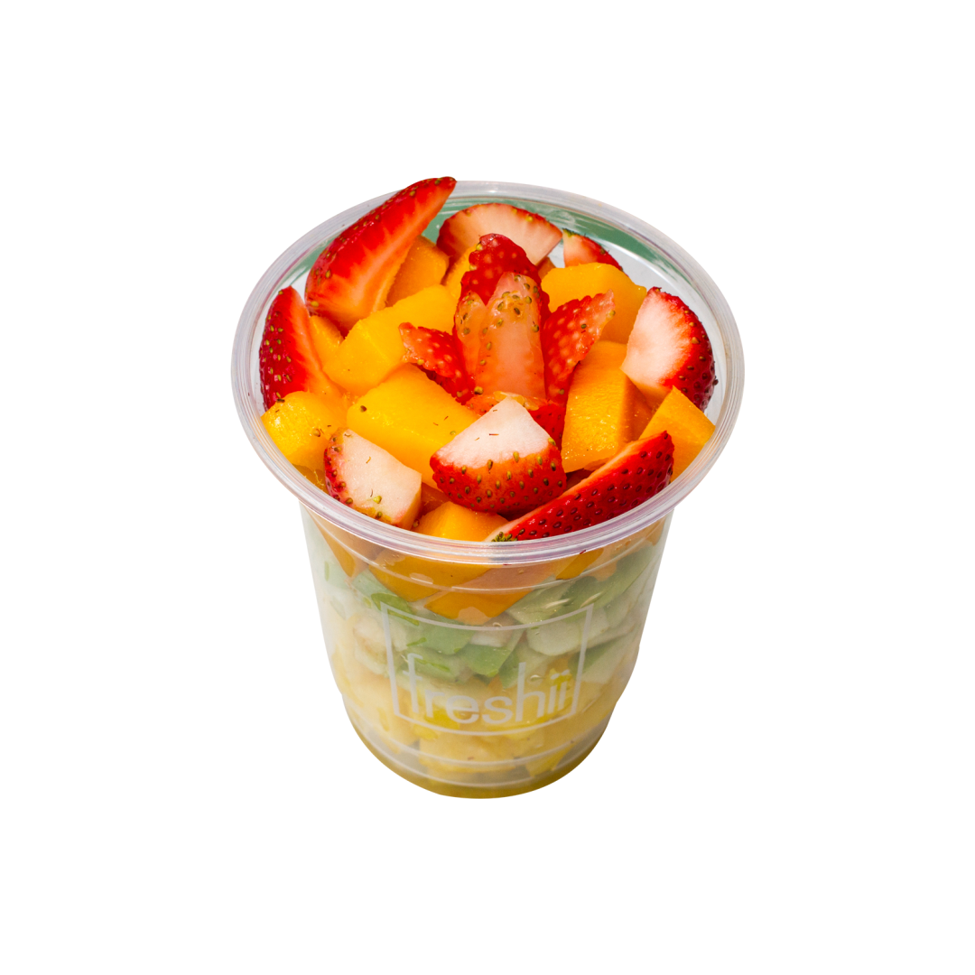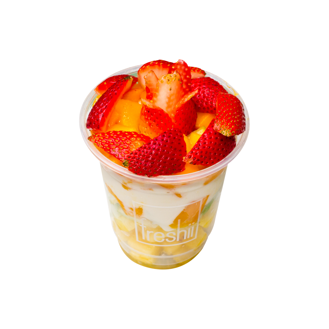 Manzana verde, mango, fresa, piña, y yogurt bajo en grasa endulzado con miel.
