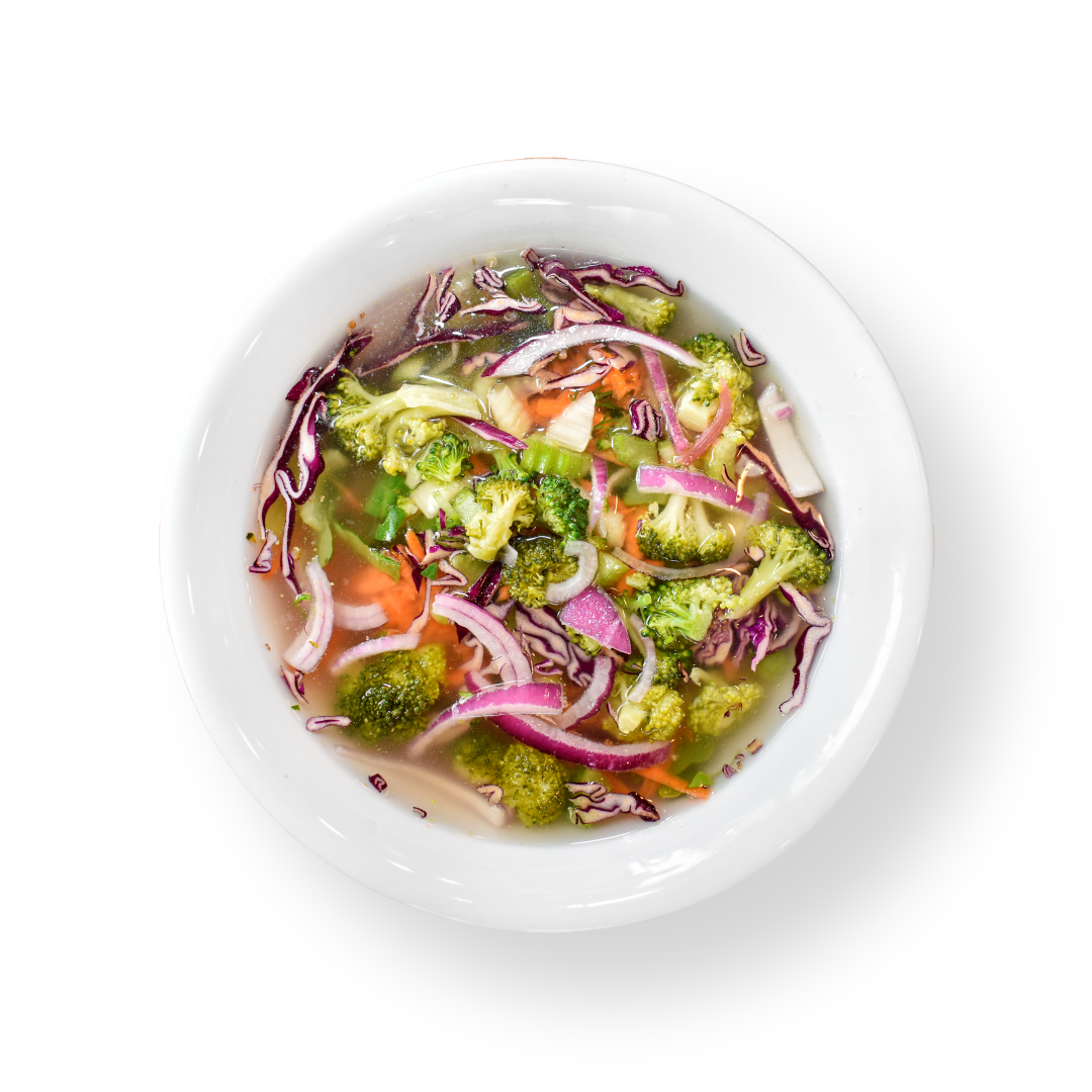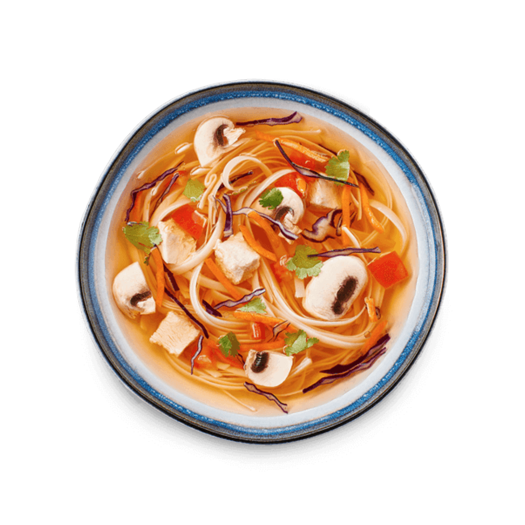 Caldo de limonaria picante, pasta de arroz, zanahoria, tomate, champiñón, cilantro y repollo picante.