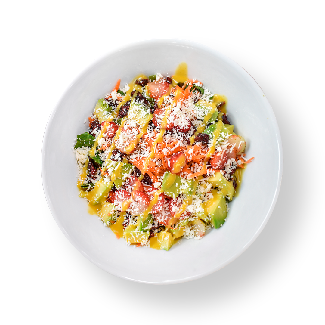 Espinaca, Lechuga Crespa, quinoa, arándanos, fresas, aguacate, zanahoria, queso feta y aderezo miel mostaza.
