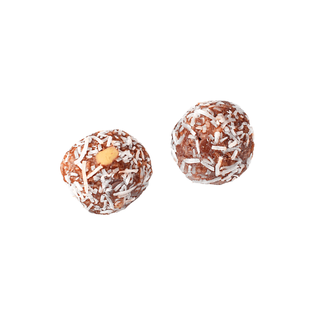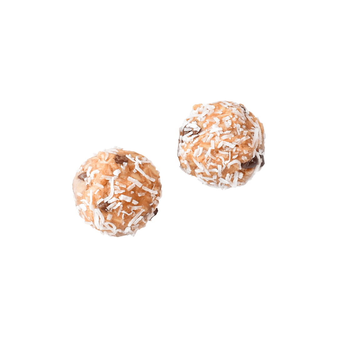 Bolitas proteicas de mantequilla de maní, avena, miel y chips de chocolate sabor Coco.