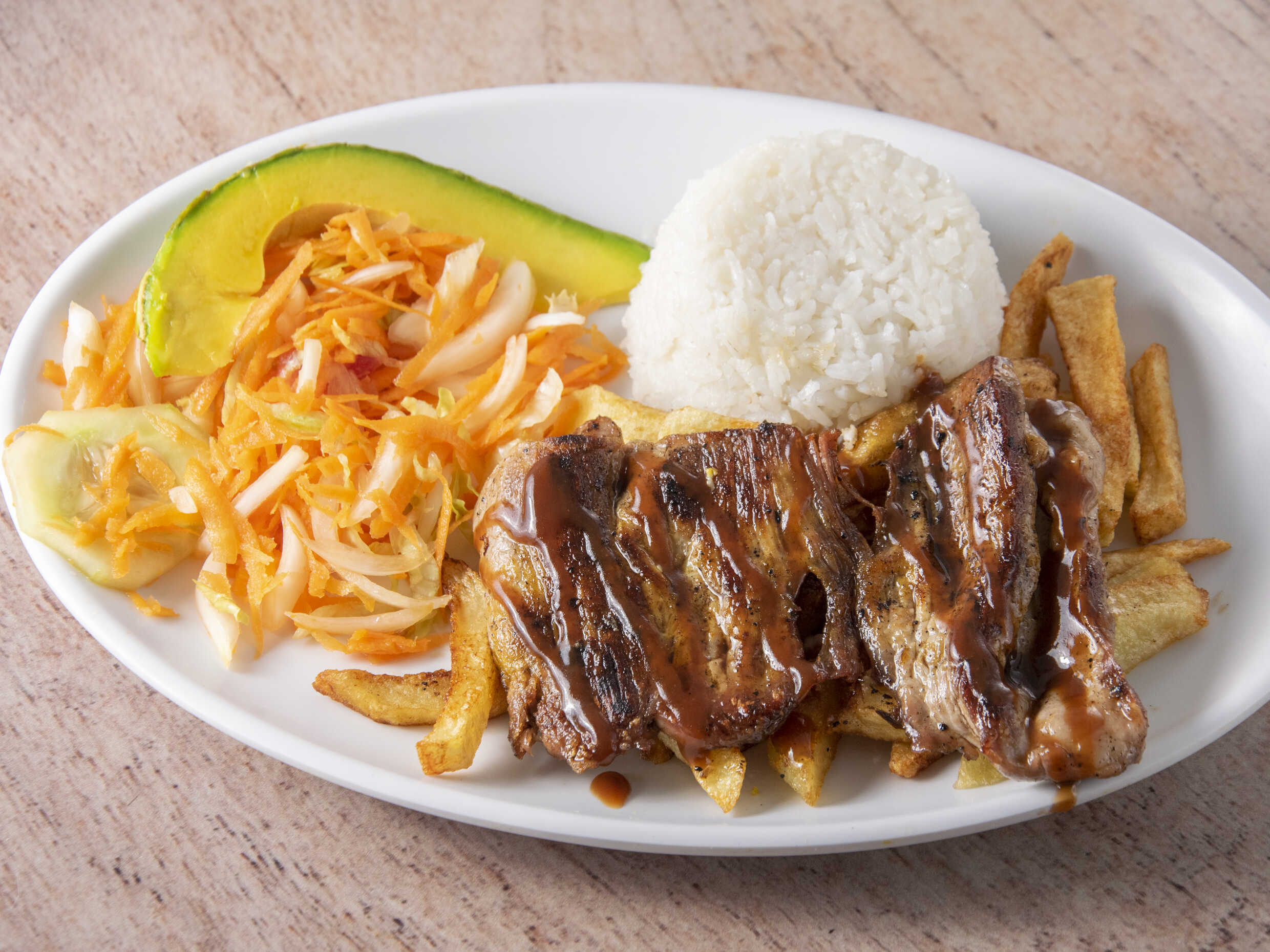 Arroz, papas a la francesa, ensalada de cebolla y tomate, aguacate, tajada de plátano, sopa del día y limonada.