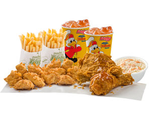 8 Presas apanadas, 11 Trozos de pechuga apanada (15 g und), 4 Tenders de pollo apanado Crispy (45 g und), 3 porciones de papas a la francesa mediana (60 g und) y Gaseosa (1.5 litros)
