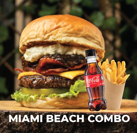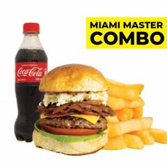 Hamburguesa Miami Master 150 g de angus beef artesanal, acompañado de queso cheddar premium, cebollitas artesanales caramelizadas, tocineta crunch, garden cheese de la casa, pan brioche con mantequilla finas y vegetales frescos, acompañado con papas francesas y bebida 500 ml.