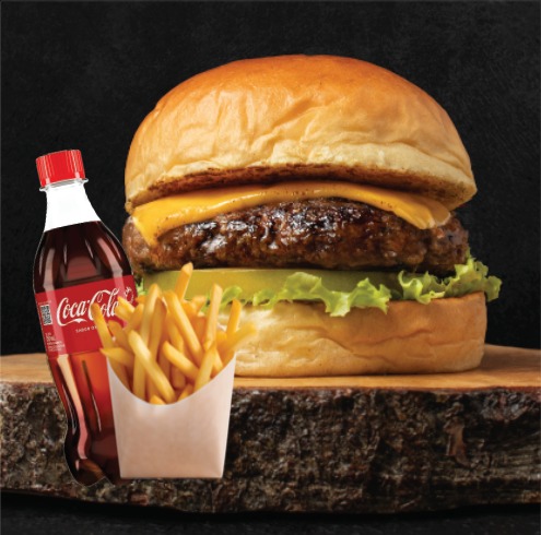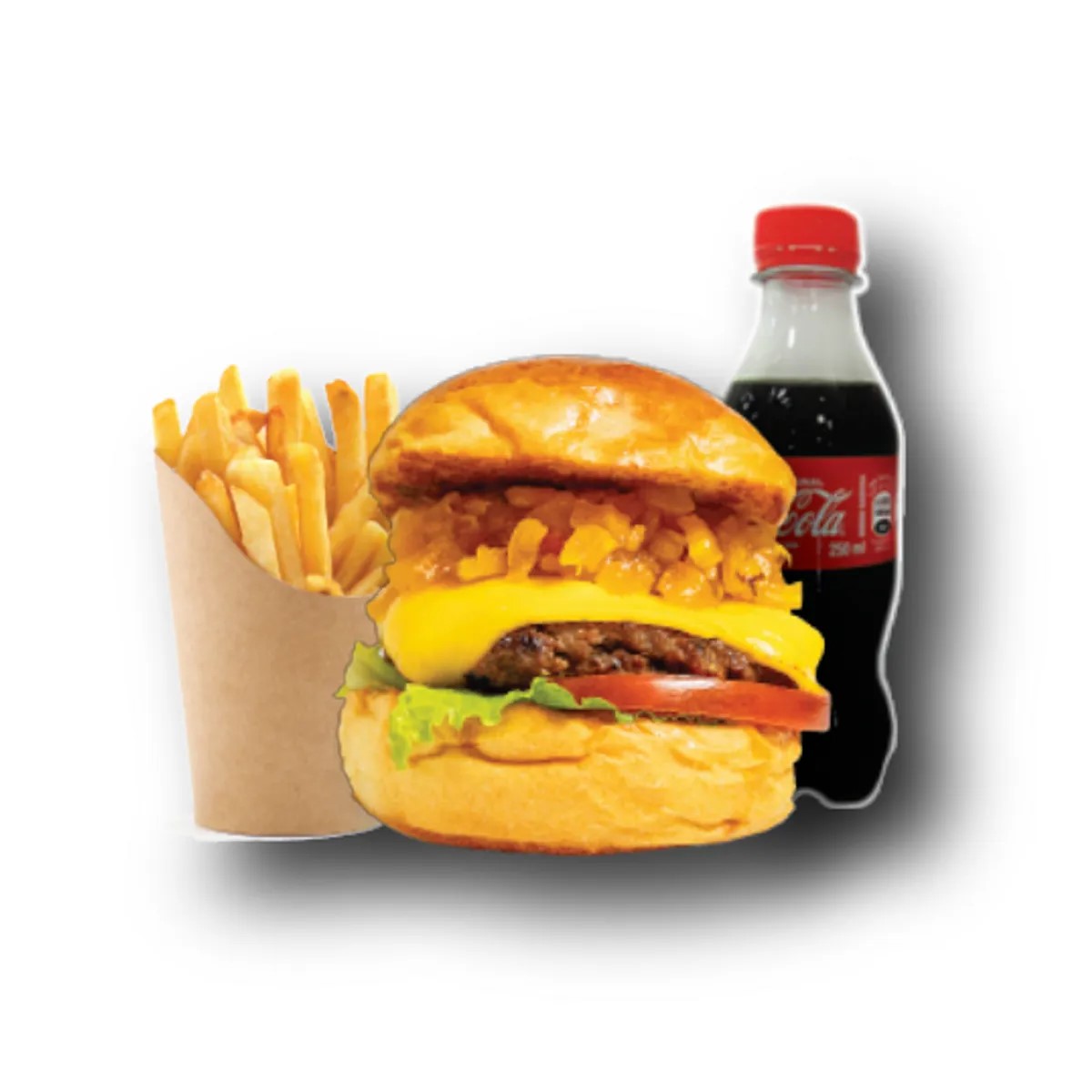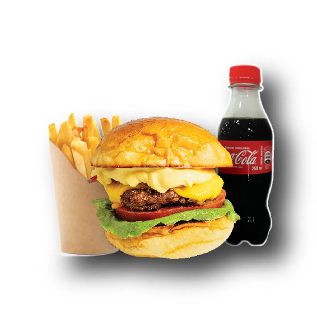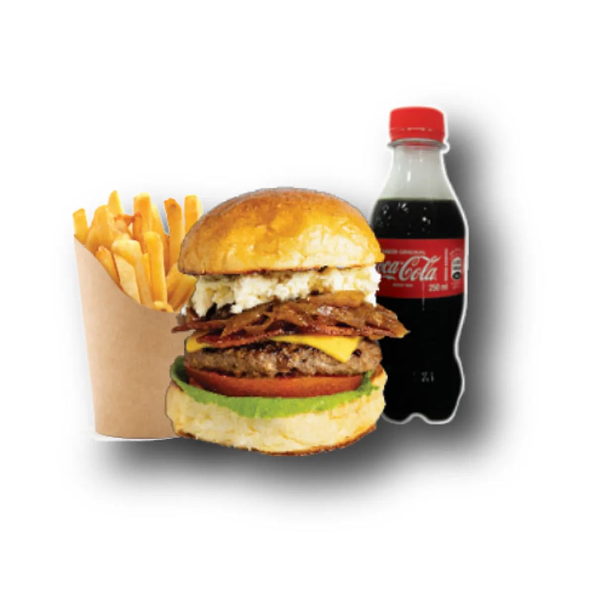 Burger con carne de 100 gr con tocineta, garden chesse, queso cheddar, cebollitas caramelizadas, pan brioche y vegetales, 100g de papas francesas y gaseosa 250ml.