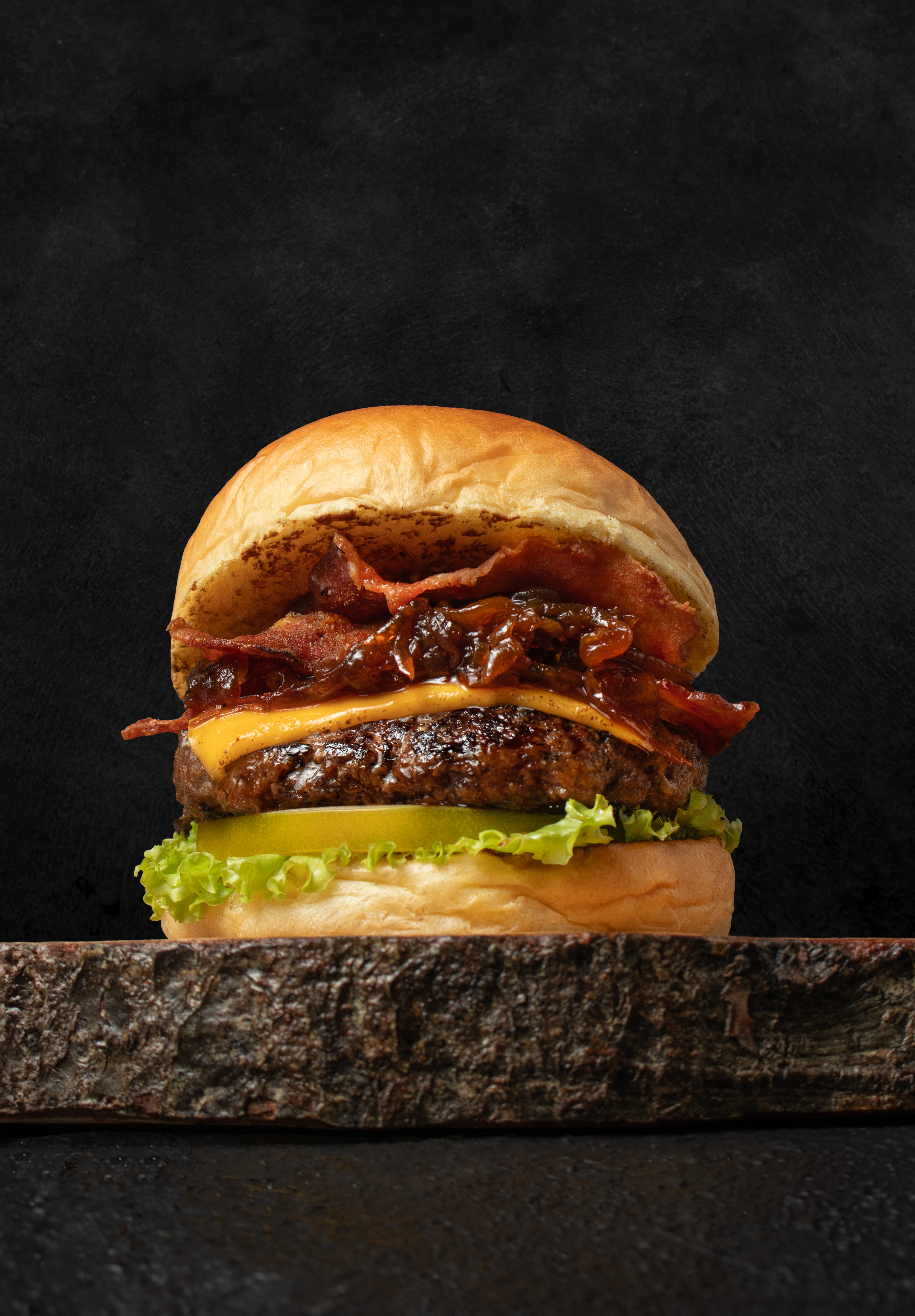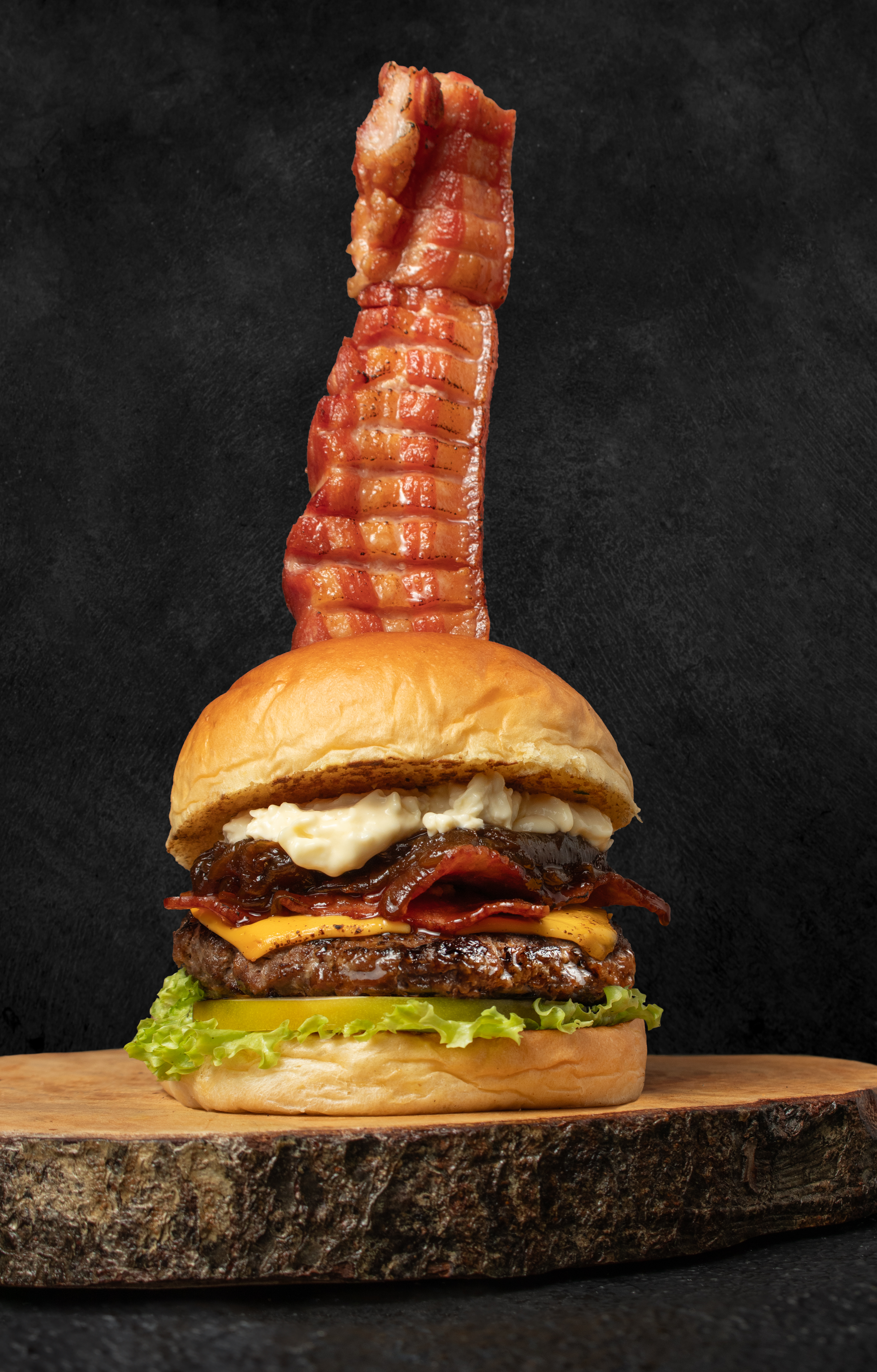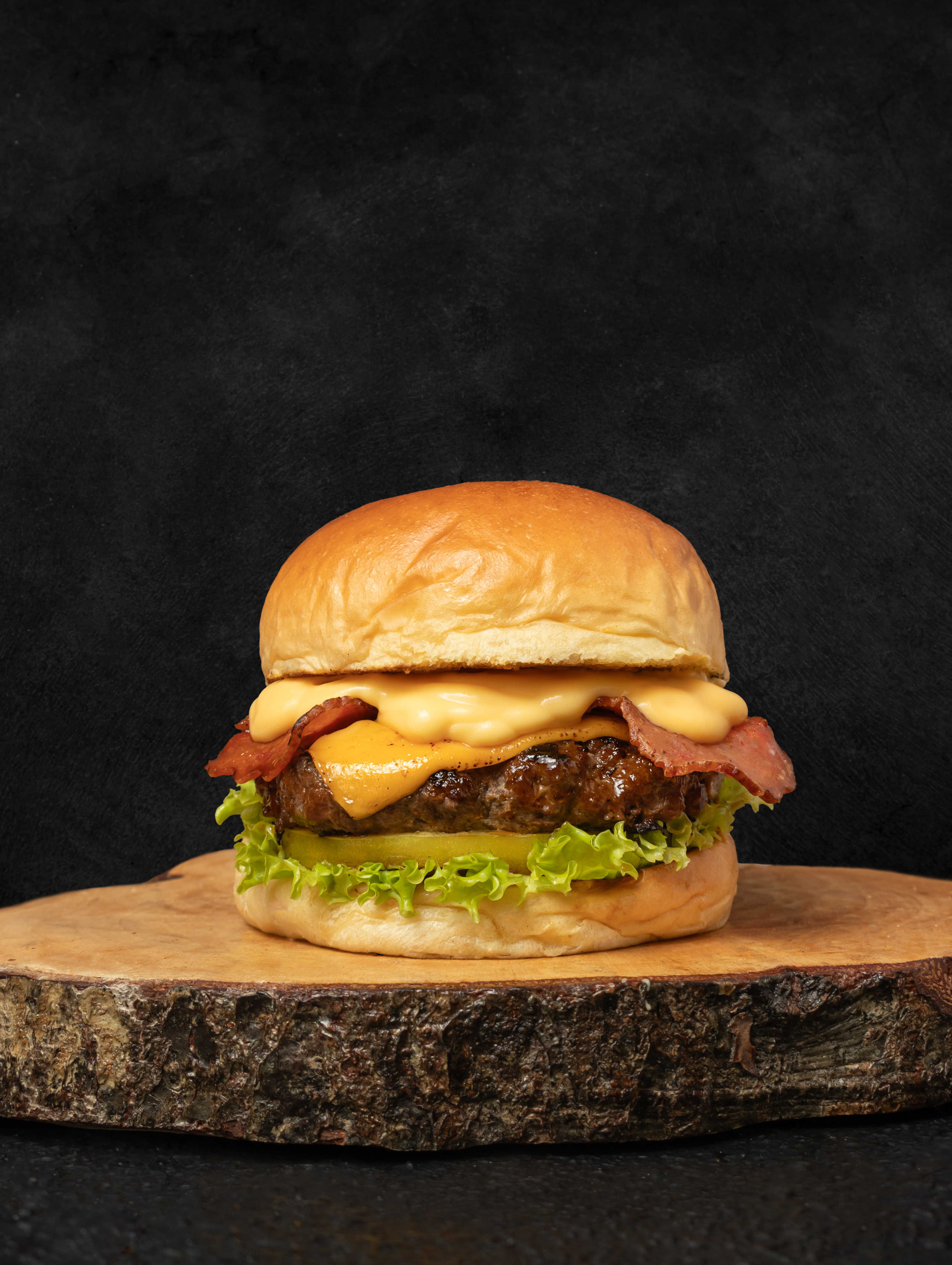 Hamburguesa New York el lugar donde los sueños han de cumplirse, 150 gr de angus beef artesanal, acompañado de queso cheddar premium, pan brioche con mantequilla finas hierbas y tocineta crunch, salsa de queso cheddar y vegetales frescos de tierras cercanas.