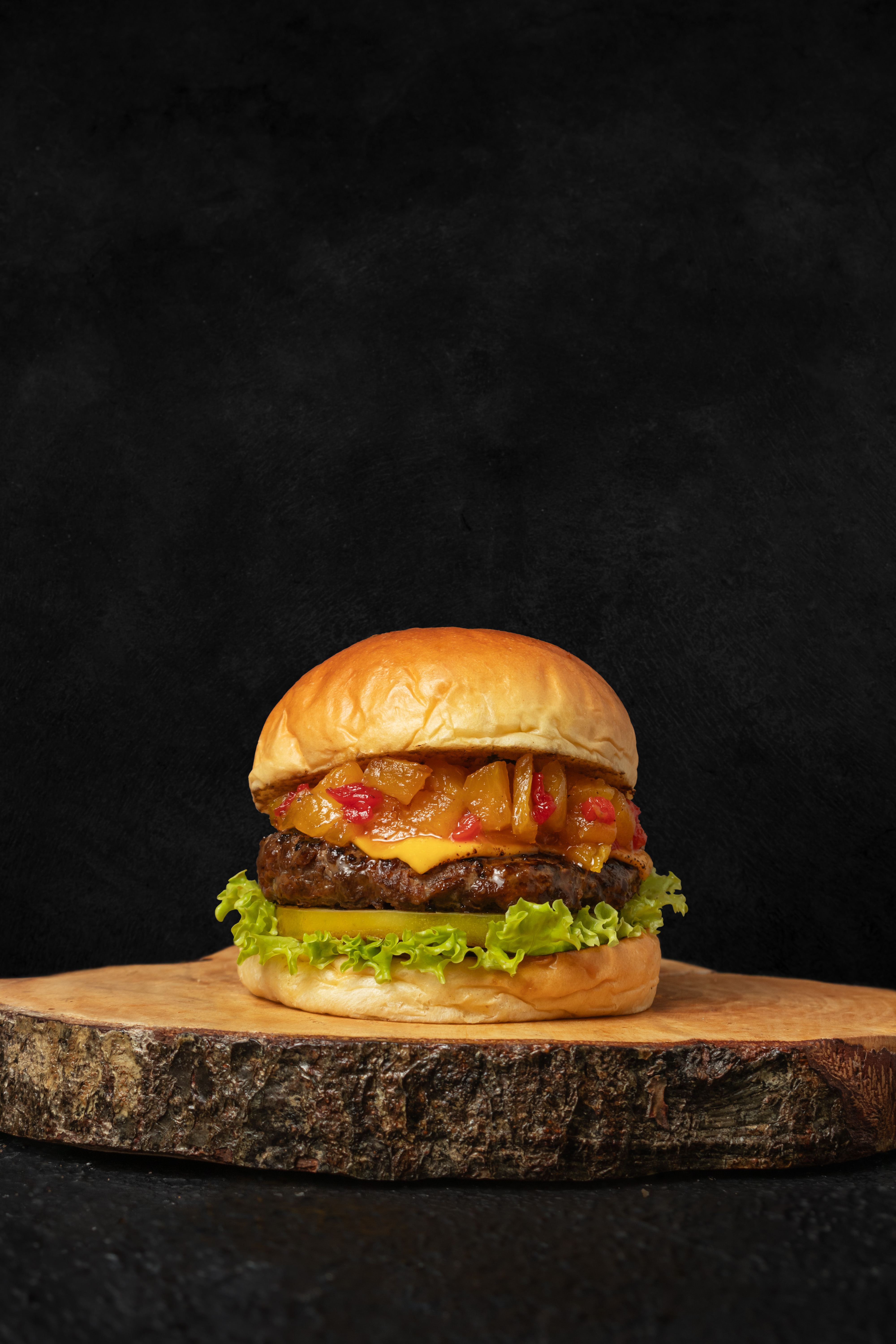 Hamburguesa Kingston town 150 gr de angus beef artesanal, acompañado de queso cheddar premium, pan brioche con mantequilla finas hierbas, aderezo artesanal de trozos de piña caramelizada en miel de abejas, trocitos de morrones asados y vegetales frescos de tierras cercanas.