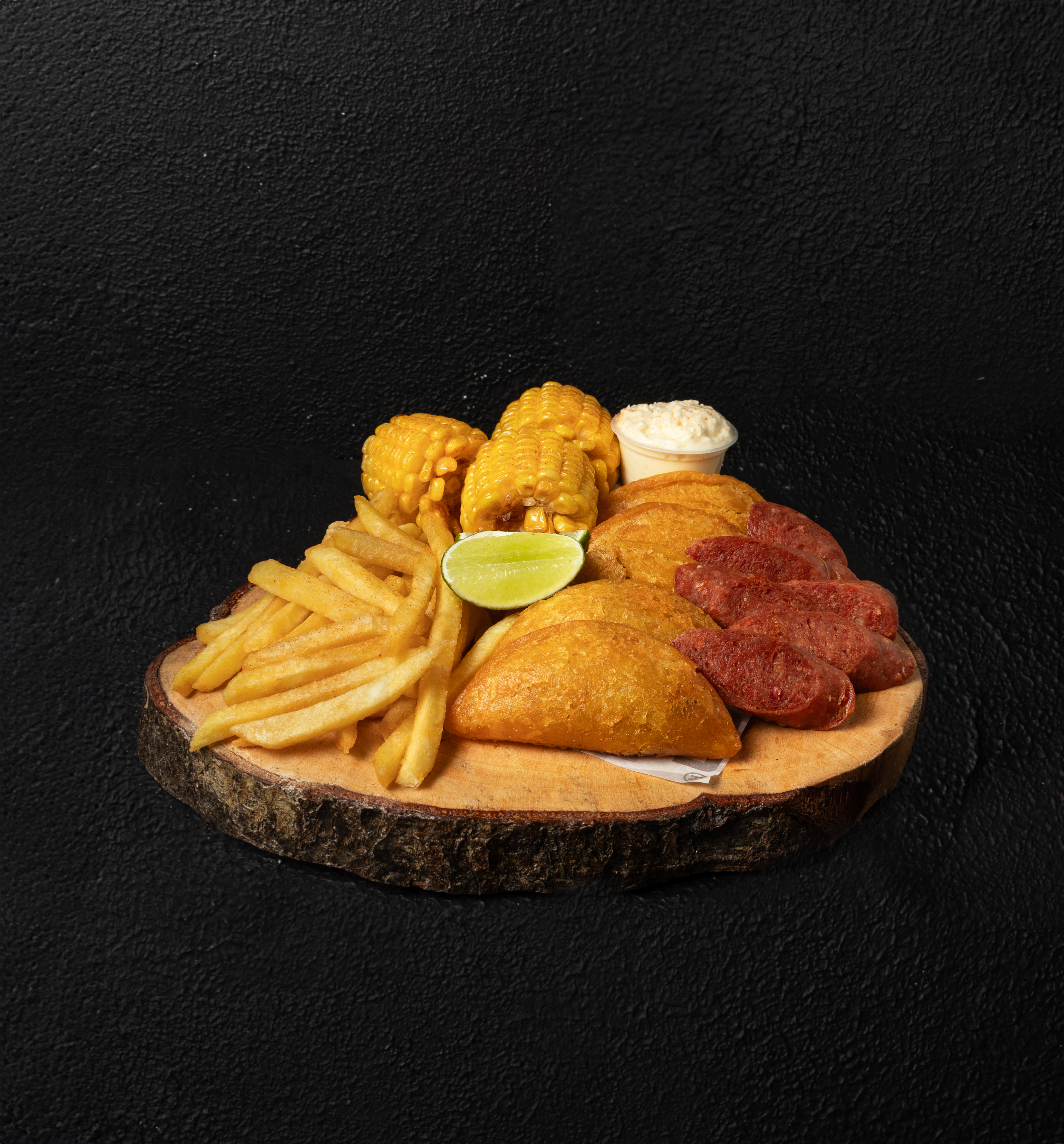 5 Mini empanadas, mazorquitas, chorizo santarosano, papas francesas, garden chesse de la casa.