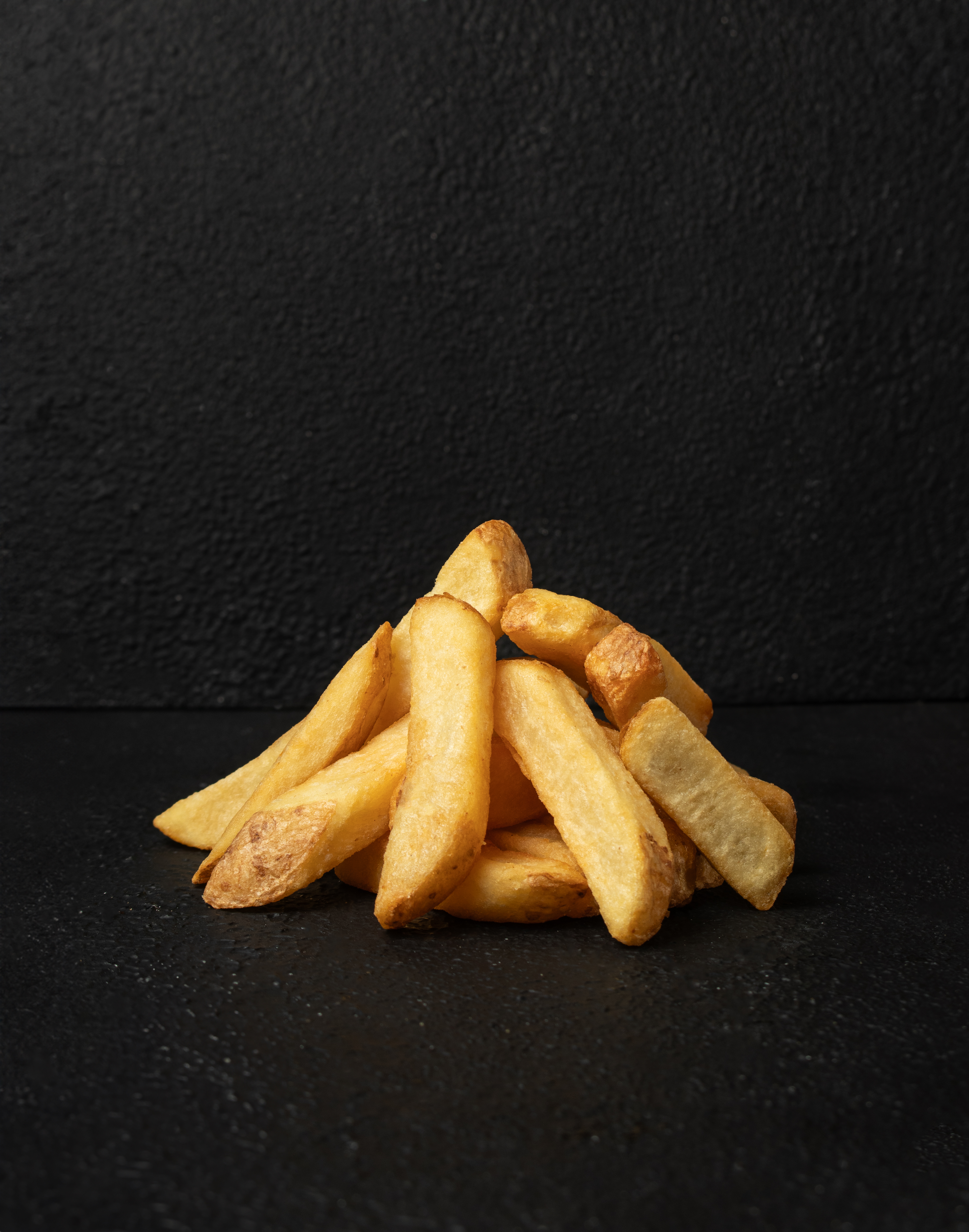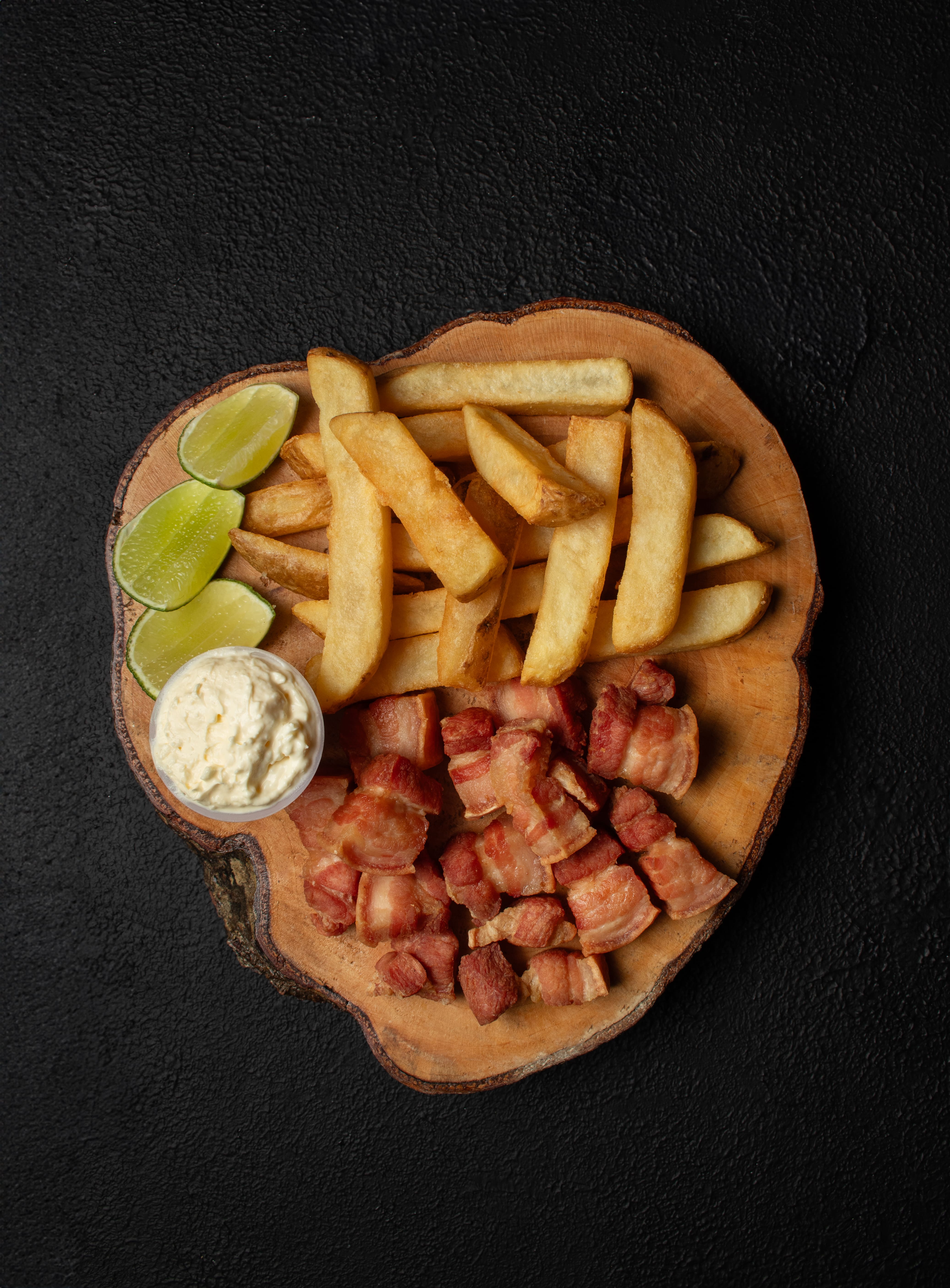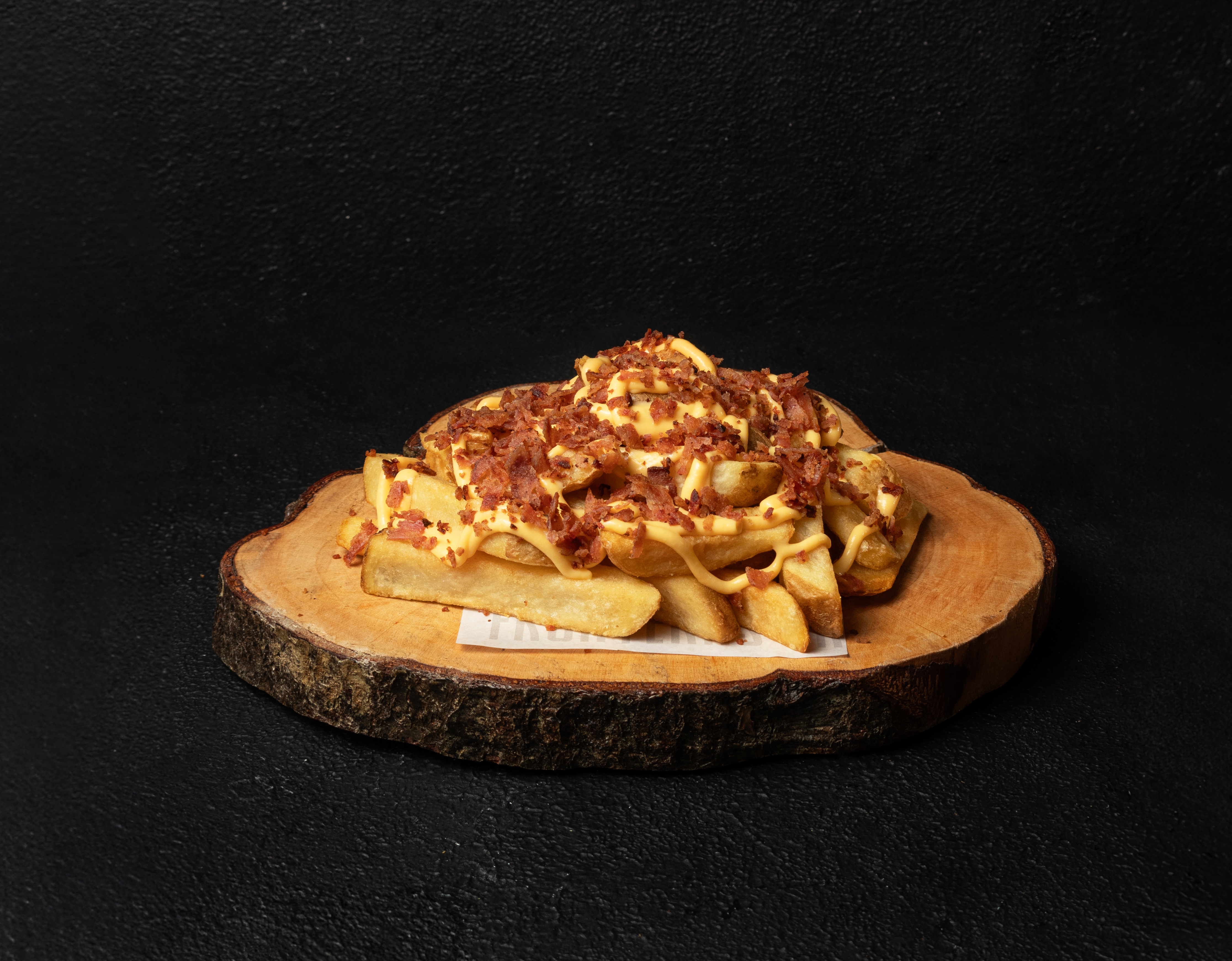 Porción de papa extragruesa de la casa, crocantes por fuera y suave por dentro, 300 g con tocineta crunch de la casa y salsa de queso cheddar.
