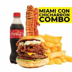 Hamburguesa Miami Master 150 g de angus beef artesanal, acompañado de queso cheddar premium, cebollitas artesanales caramelizadas, tocineta crunch, garden cheese de la casa, pan brioche con mantequilla finas y vegetales frescos, acompañado del chicharrón de la casa, papas francesas y bebida 500 ml.