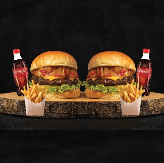 2 Hamburguesas Kingston town 90 gr cada una de angus beef artesanal, acompañado de queso cheddar premium, pan brioche con mantequilla finas hierbas, aderezo artesanal de trozos de piña caramelizada en miel de abejas, trocitos de morrones asados y vegetales frescos de tierras cercanas, acompañadas de dos papas a la francesa y dos coca cola 250 ml.