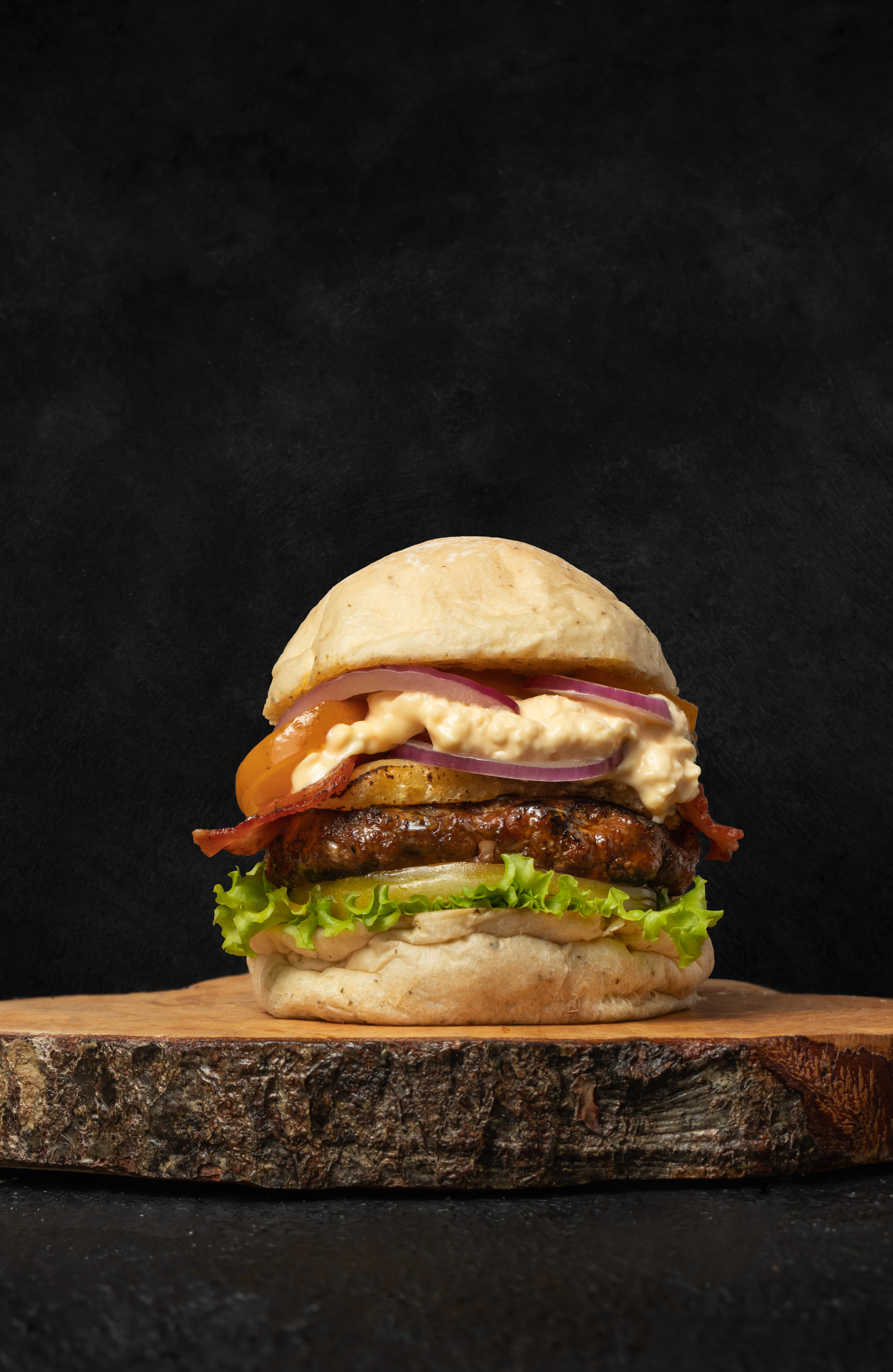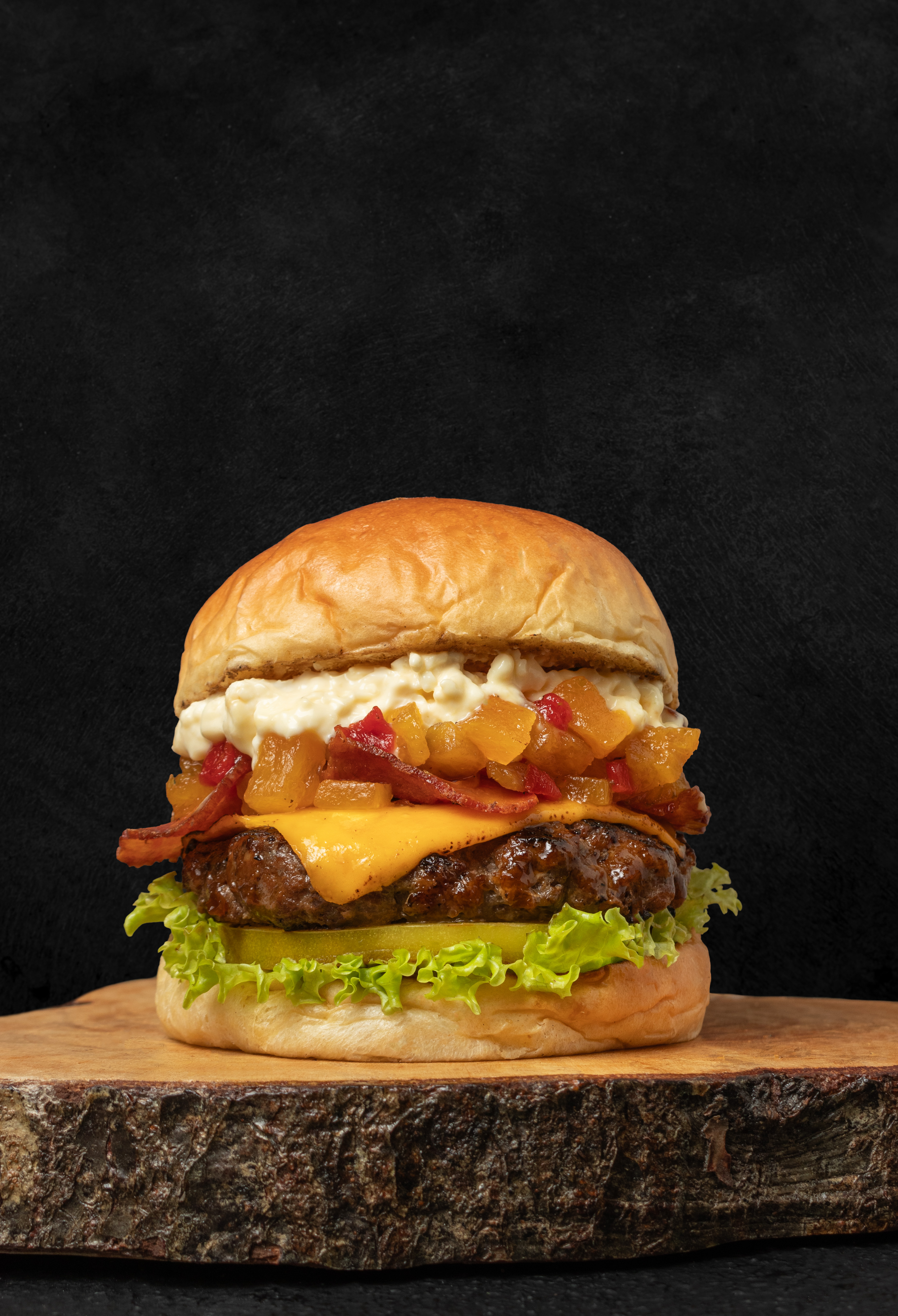 Hamburguesa Las Vegas 150 g de angus beef artesanal acompañado de queso cheddar premium pan brioche con mantequilla finas hierbas aderezo artesanal de trozos de piña caramelizada dos en miel de abejas trocitos de morrones asados tocineta crunch, Garden cheese y vegetales frescos de tierras cercanas.