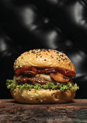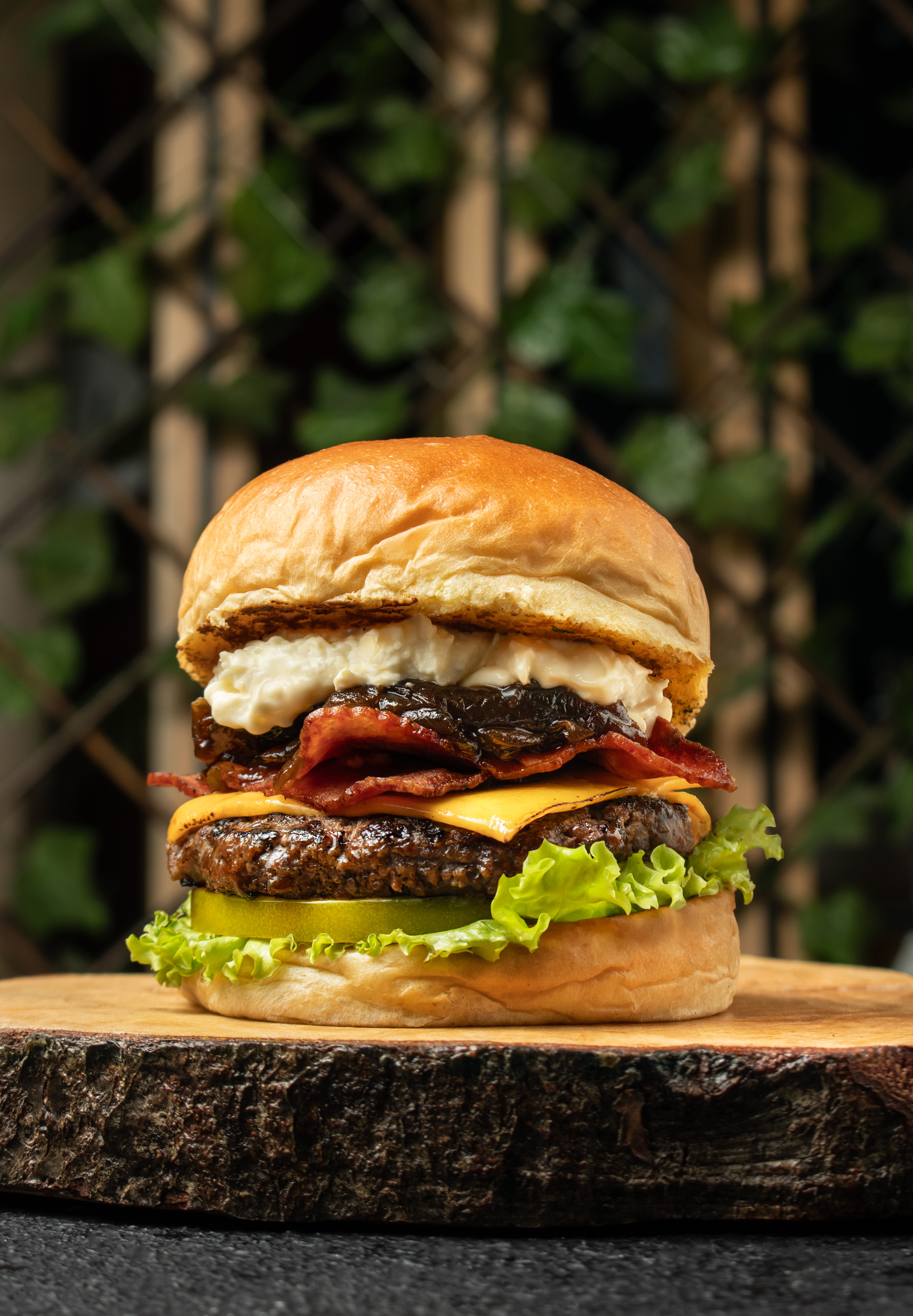 Burger con carne de 100 gr, tocineta, garden chesse, queso cheddar, cebollitas caramelizadas, pan brioche y vegetales.