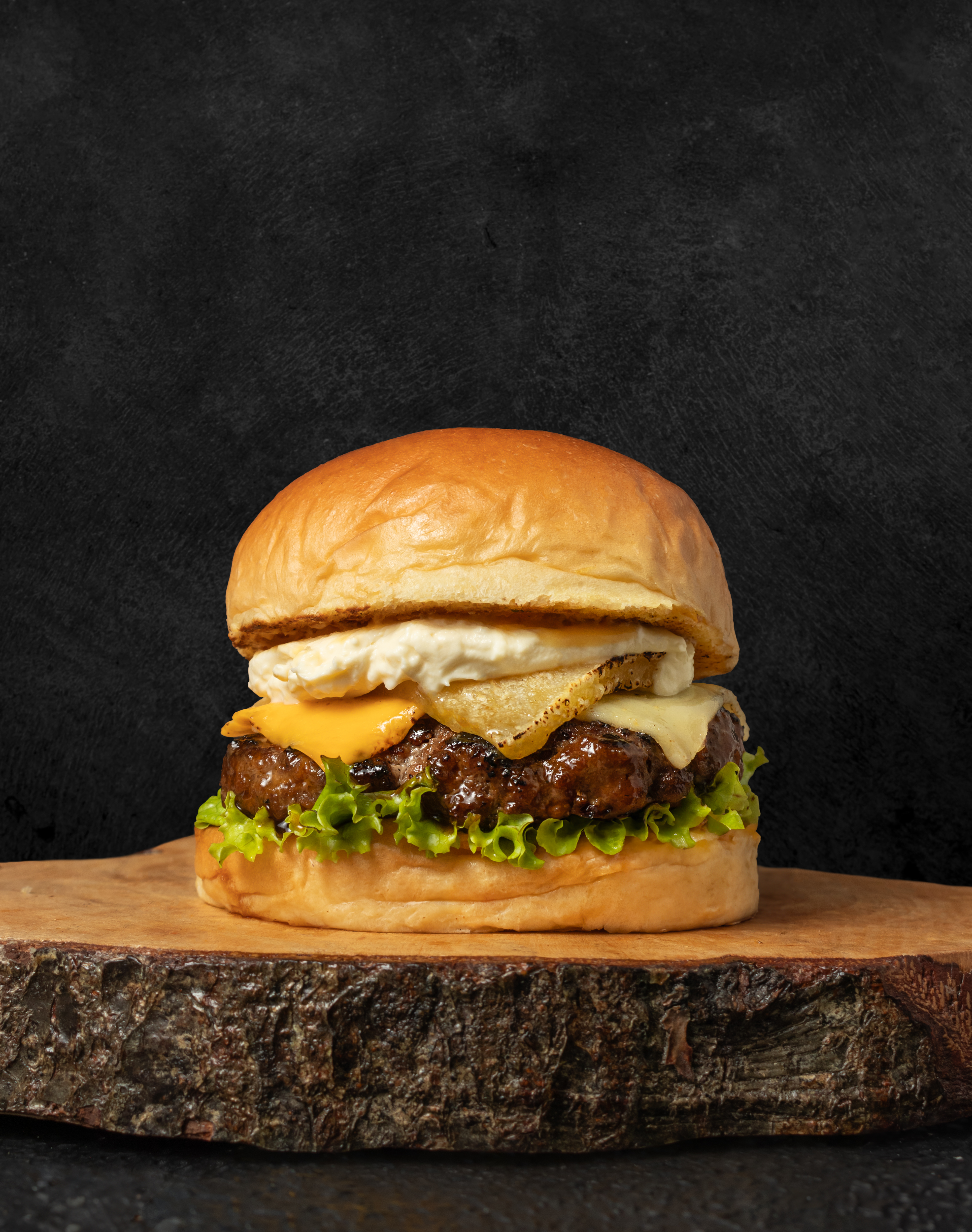 Hamburguesas 150 gr de angus beef artesanal, acompañado de queso cheddar premium, pan brioche con mantequilla finas hierbas, moneditas de plátano maduro, mayonesa de aguacate, chicharrón premium de la casa, suero de la casa y casquitos de limón.