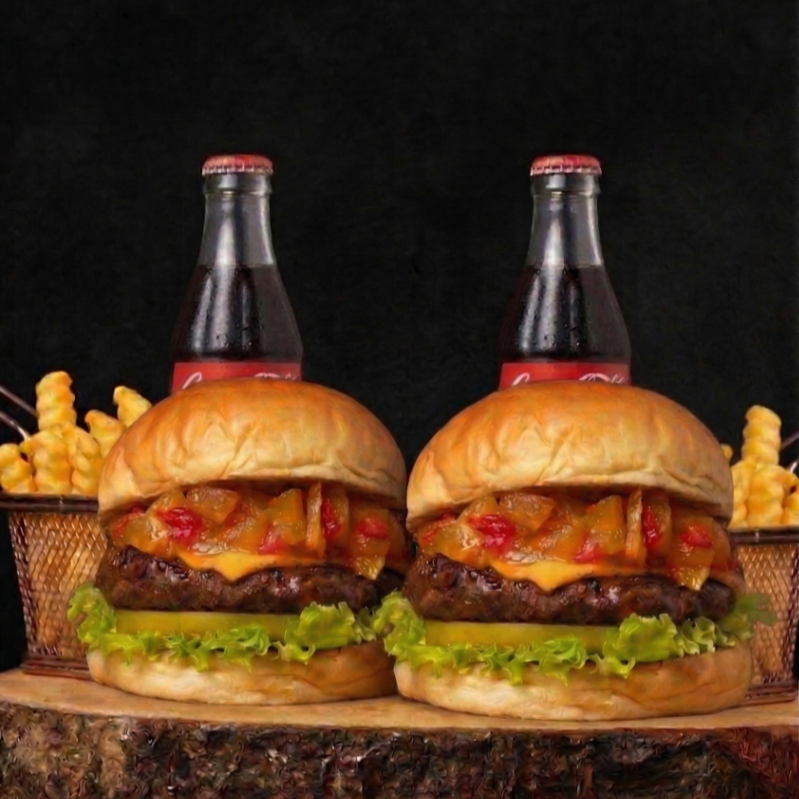 2 Hamburguesas Kingston town 90 gr cada una de angus beef artesanal, acompañado de queso cheddar premium, pan brioche con mantequilla finas hierbas, aderezo artesanal de trozos de piña caramelizada en miel de abejas, trocitos de morrones asados y vegetales frescos de tierras cercanas, acompañadas de dos papas a la francesa y dos coca cola 250 ml.