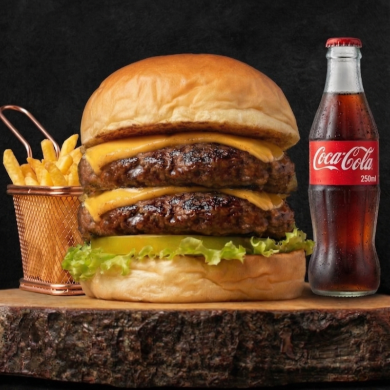 Dos Burger con carne de 100 gr con tocineta, garden chesse, queso cheddar, cebollitas caramelizadas, pan brioche y vegetales, 100g de papas francesas y gaseosa 250ml.