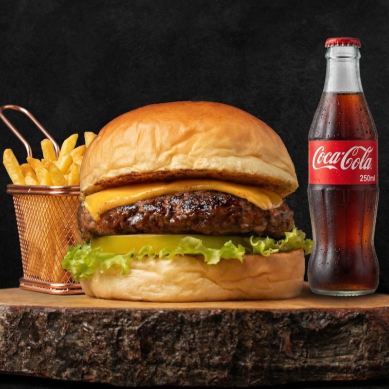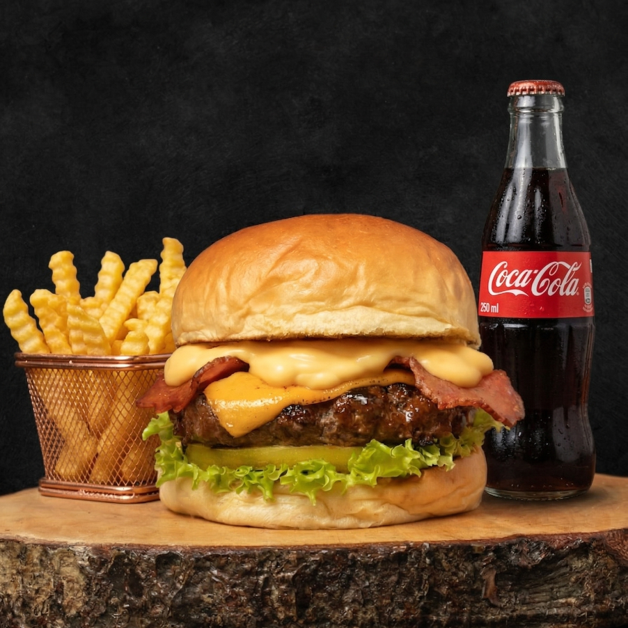Burger con carne de 100 gr con tocineta, garden chesse, queso cheddar, cebollitas caramelizadas, pan brioche y vegetales, 100g de papas francesas y gaseosa 250ml.
