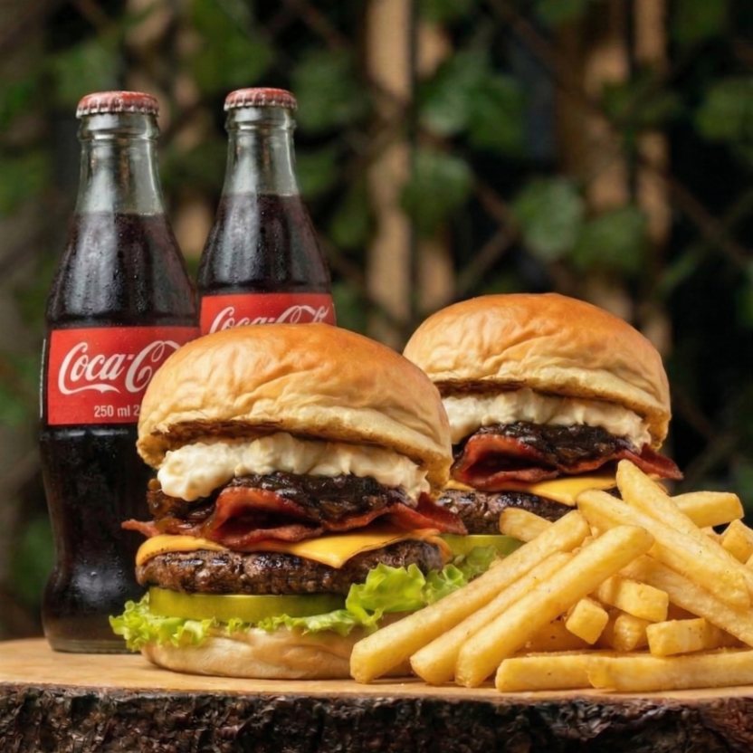 Dos Burger con carne de 100 gr con tocineta, garden chesse, queso cheddar, cebollitas caramelizadas, pan brioche y vegetales, 100g de papas francesas y gaseosa 250ml.
