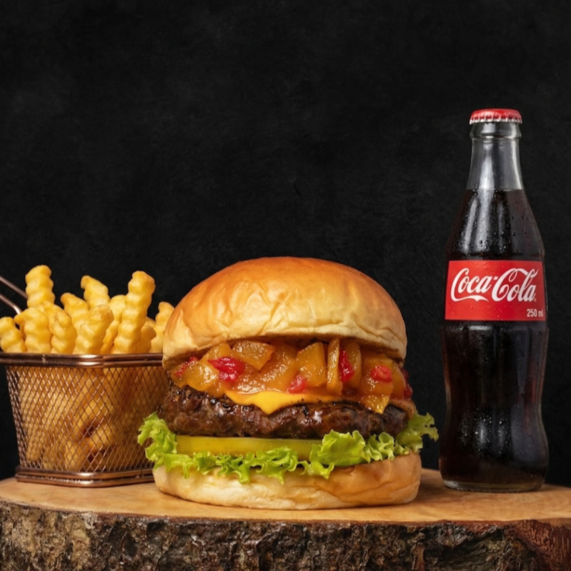 Hamburguesa de compota de cristales de papayuela, queso paipa, crema suave de maravilla, explosión de carne de res y cerdo, tocineta, pan blanco de orégano, tomate y lechuga, acompañado del chicharrón de la casa, papas francesas y bebida 500 ml.