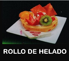 Rollo de helado, crema de leche, queso, durazno, kiwi, fresa, pitaya, cereza, grajeas y barquillos.