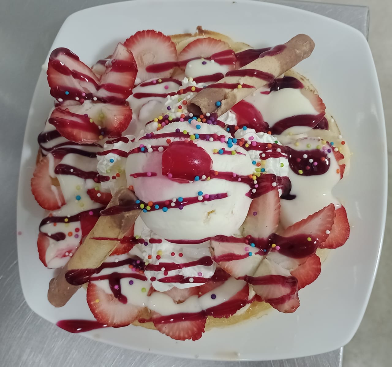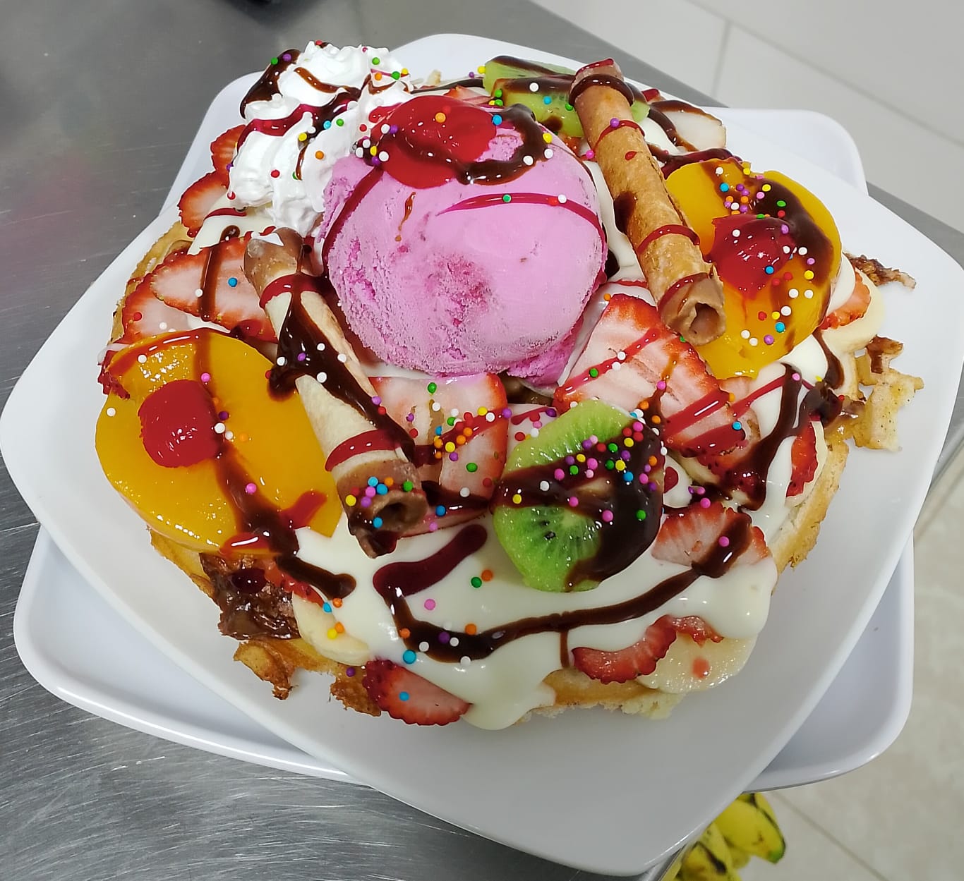 Tortilla de waffle, Nutella, fresas y banano picado, crema de leche, porción de helado, crema chantilly, barquillos, cerezas, durazno y kiwi.