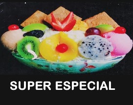 Picado de fruta(papaya, banano, manzana,mango,fresa),crema de leche,queso,1/2galleta de helado,durazno,kiwi,pitaya,fresa,manzana,uva,cereza,dulce de mora.