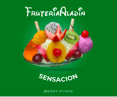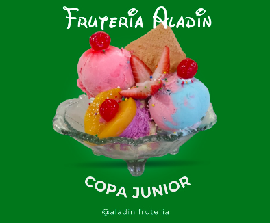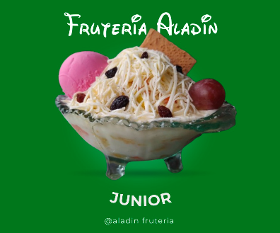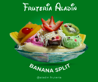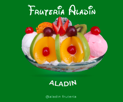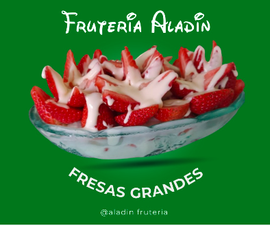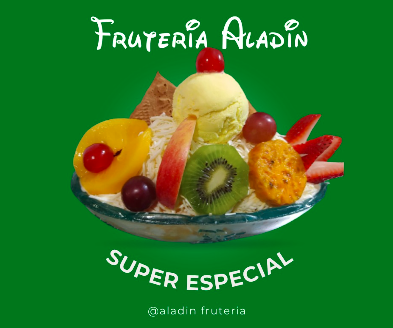 Fresa, manzana, mango, papaya, banano, piña, durazno, uva y helado.