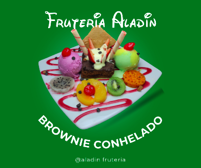 Brownie, dos porciones de helado, decorado con: durazno, cereza, kiwi, crema chantilly, salsa de mora y miel.