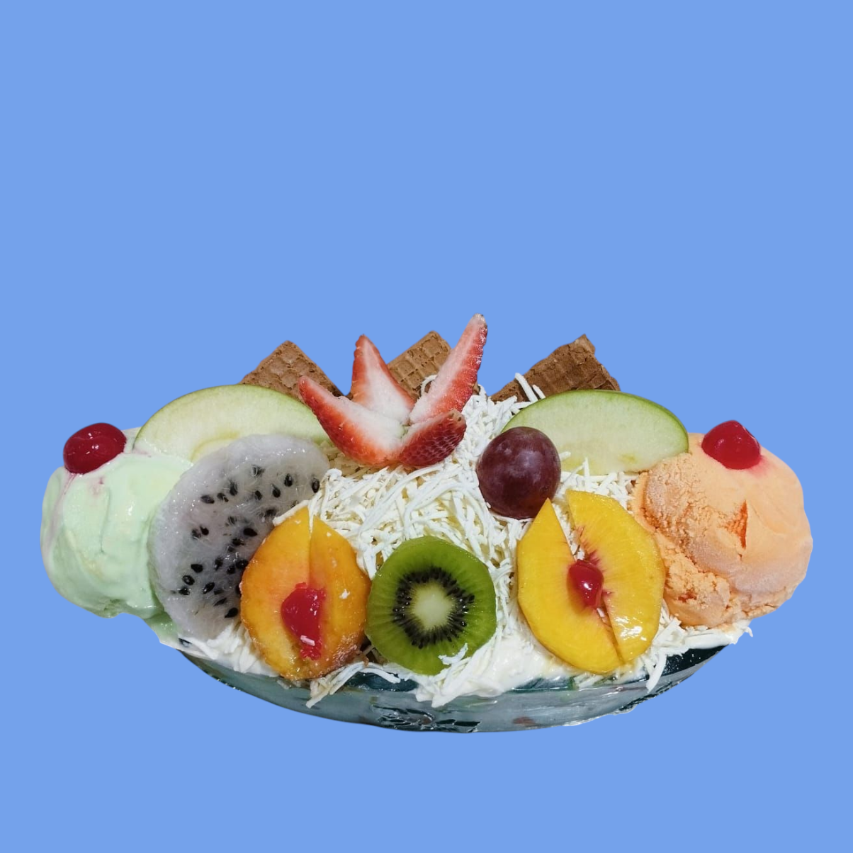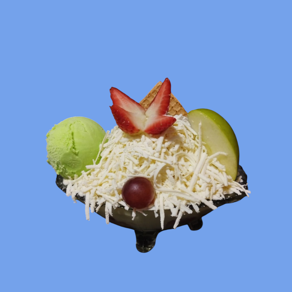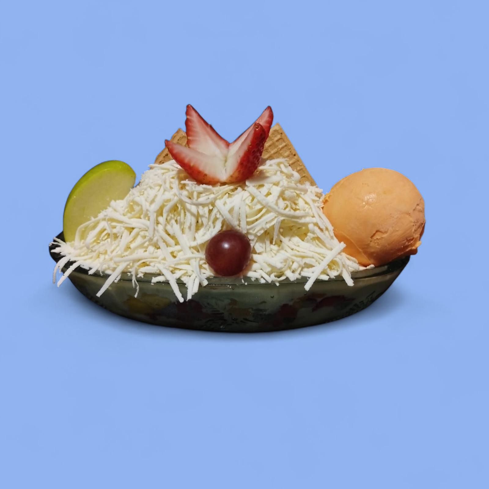 2 bolas de helado, combinación especial de frutas, crema de leche, queso, decoración, gelatina