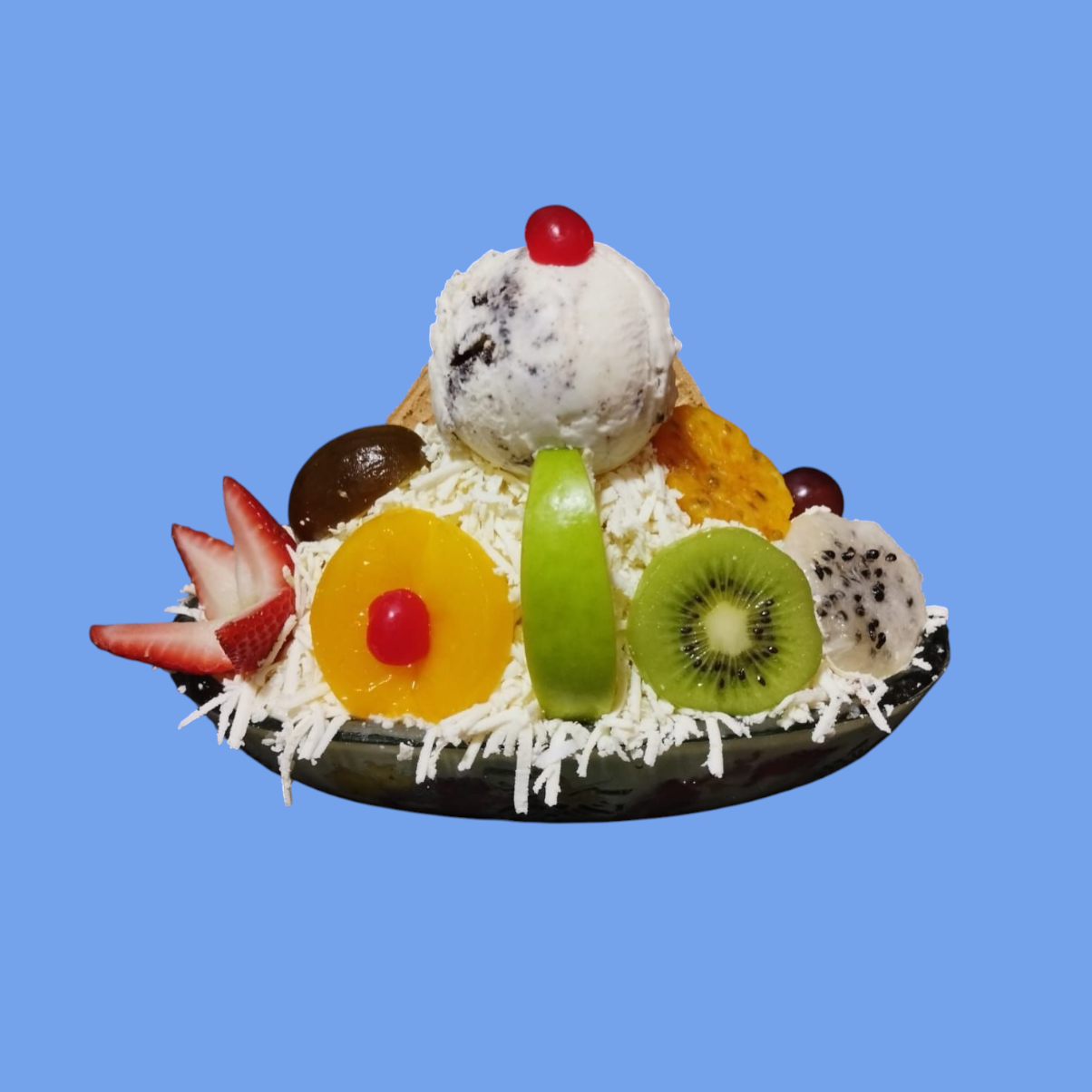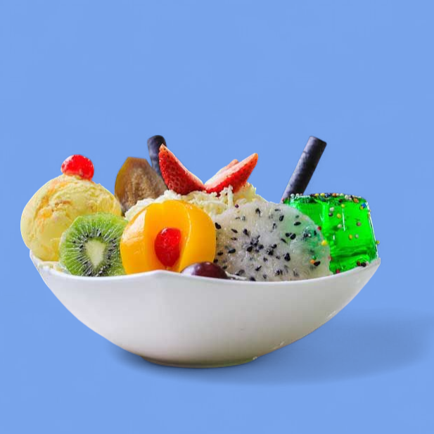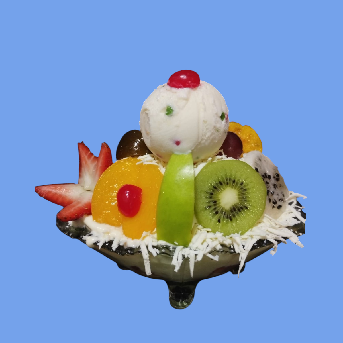 2 bolas de helado, combinación especial de frutas, crema de leche, queso, decoración, gelatina