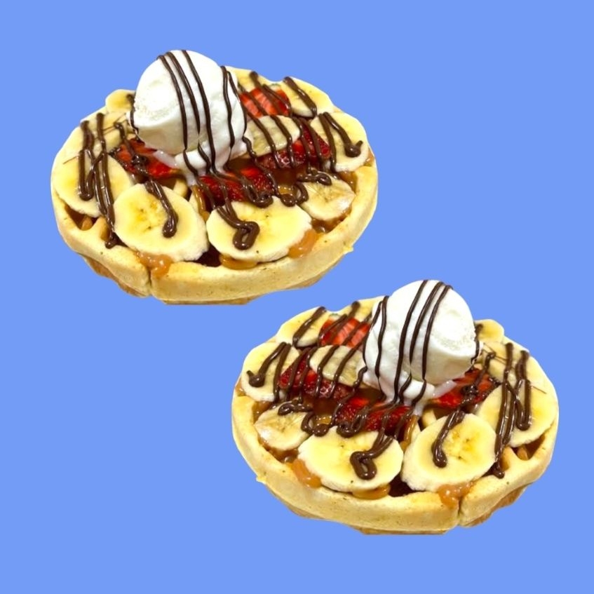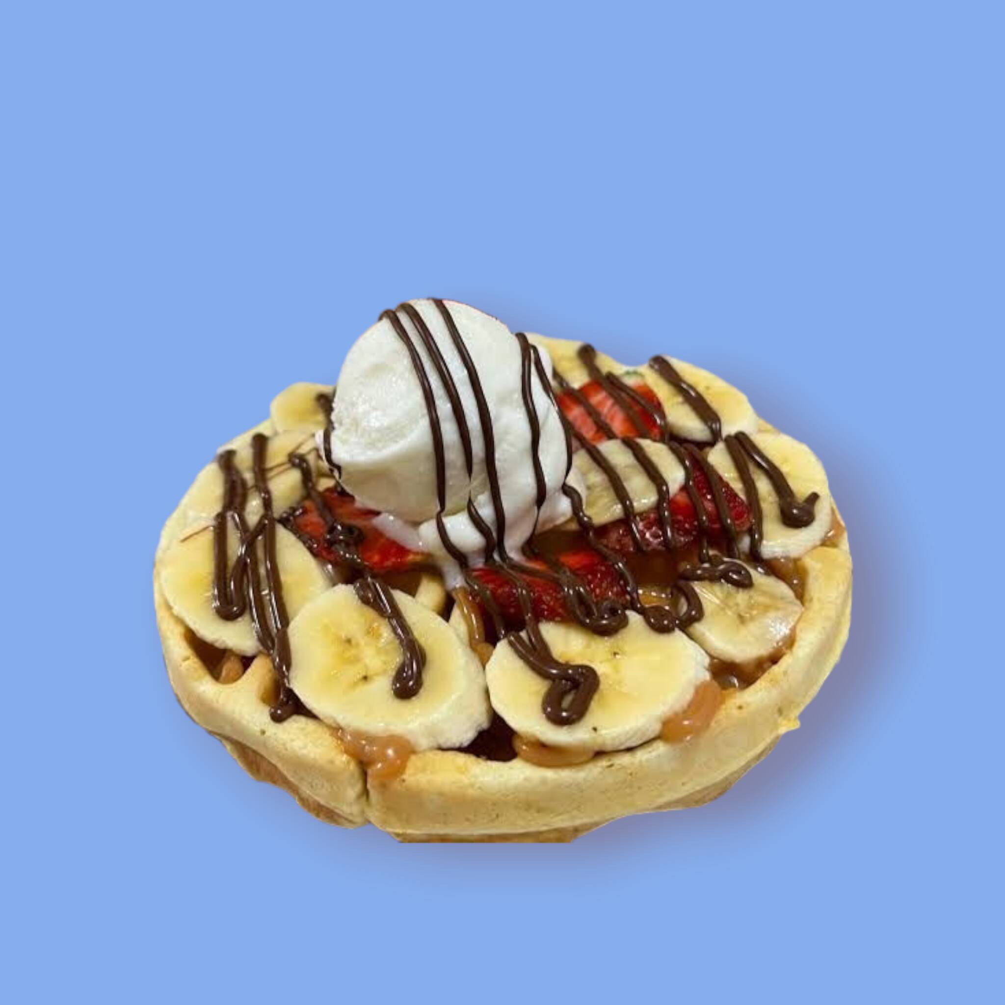2Bolas de Helado c/u, 4crepas Waffle dorado con helado, Crema de la Casa,Fresa, Banano Salsa de Mora o Chocolate