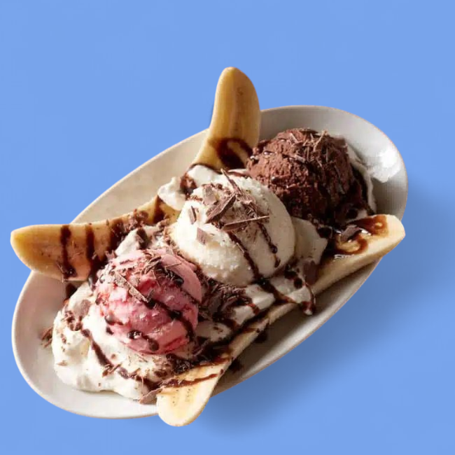Banana con bolas de helado, crema batida, Kiwi, Durazno,Pitaya, Ciruelas,Fresa, Salsa de Mora