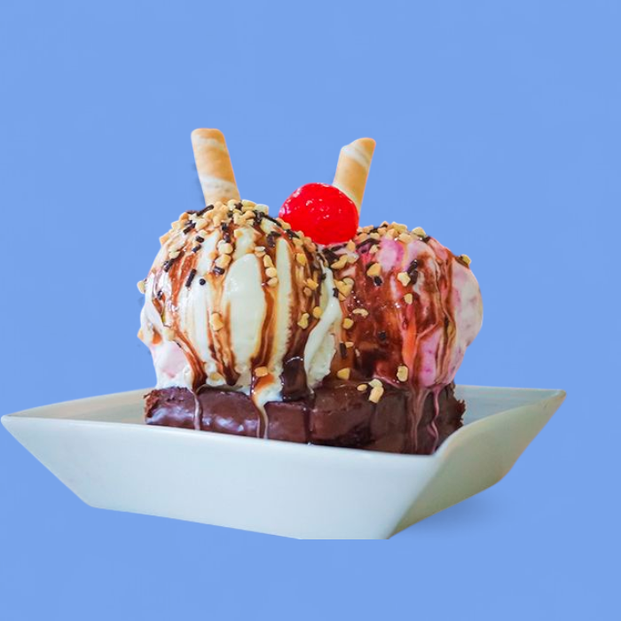 Brownie Con Dos bola de helado, cubierto de jarabe de chocolate, Fresa,Kiwi, Durazno, Ciruelas, Manzana, Pitaya.