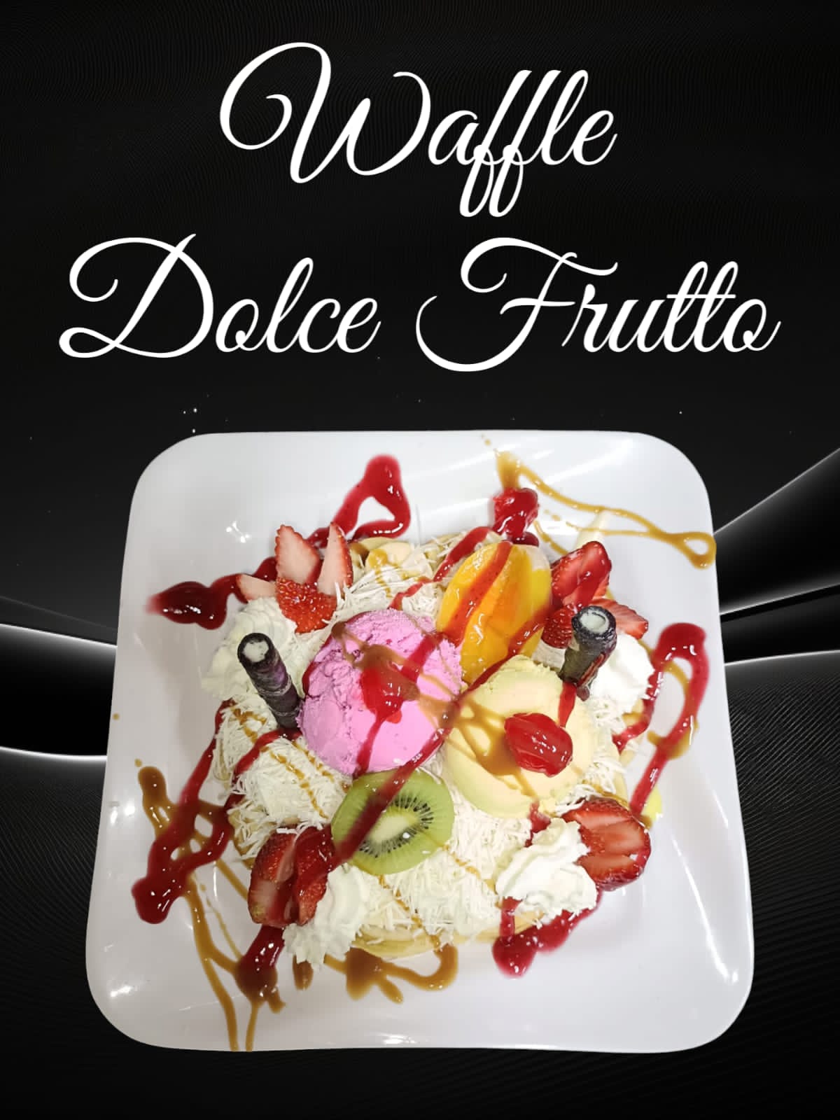 Waffle, 2 de helado, porción de queso, crema, fresas, durazno, banano, kiwi, pitaya, higo, cerezas, barquillos, salsa de mora y salsa de dulce de leche..