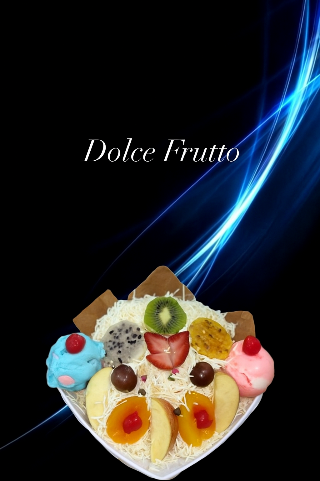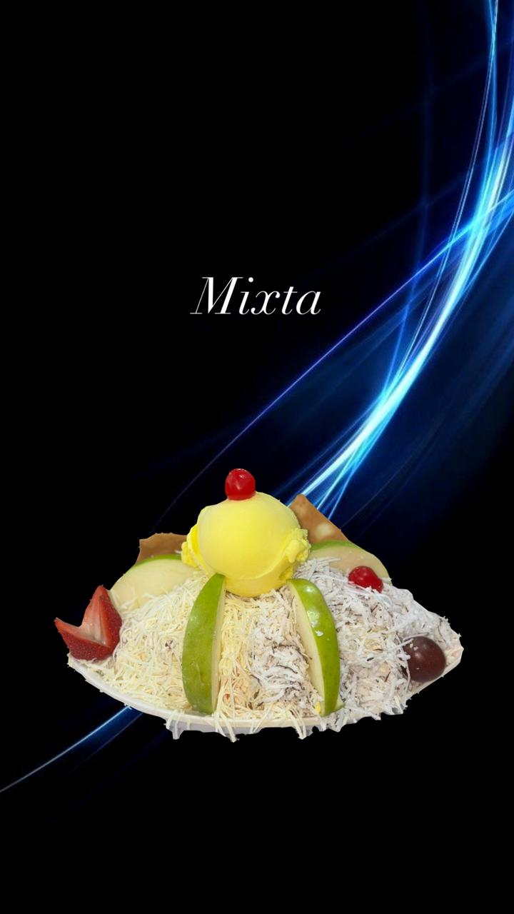 Porción de fruta, porción de helado, queso rayado y crema. Decoración: Durazno, kiwi, higo o pitaya, cerezas, fresas, uvas, manzana, salsa de mora y galletas. 24 Oz