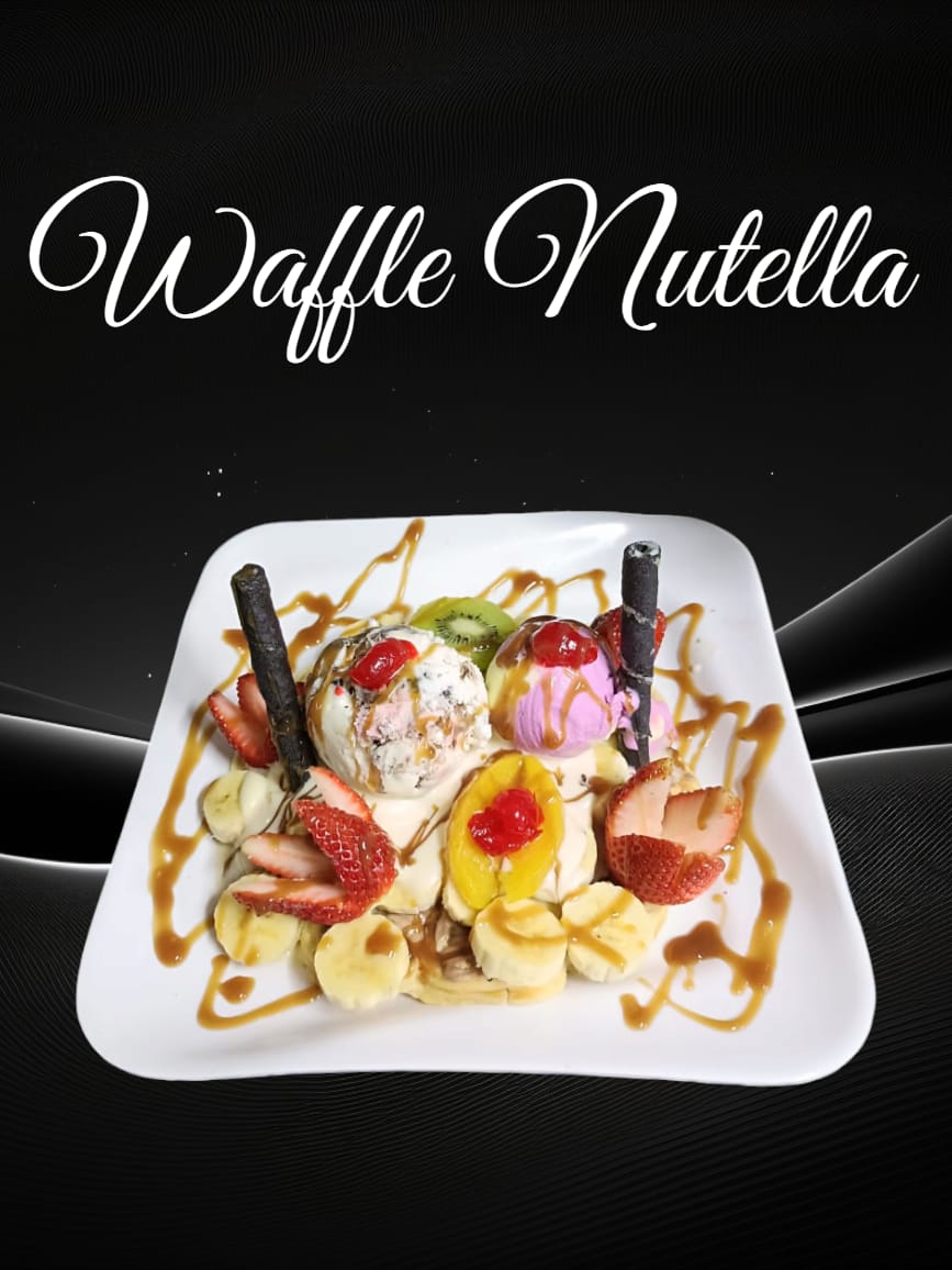 Waffle, 2 bolas helado, banano, fresas, barquillos, cerezas, durazno, kiwi, Nutella, chocolate y crema.